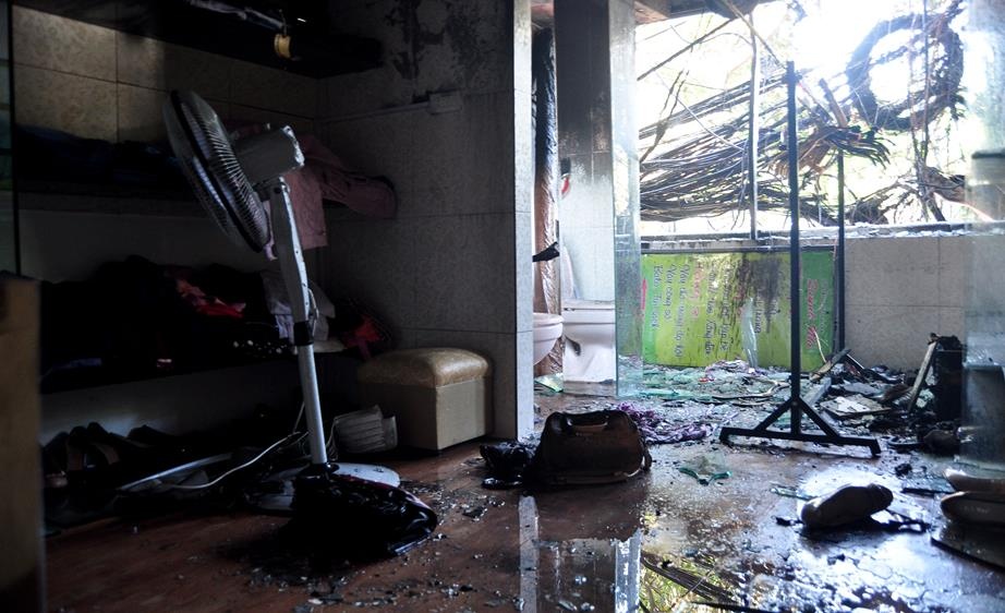 Ngọn lửa bùng lên nhanh chóng từ cột dây điện và lan sang hai nhà dân sát bên khiến cửa hàng bán quần áo số 1 Triều Khúc bị thiêu rụi.