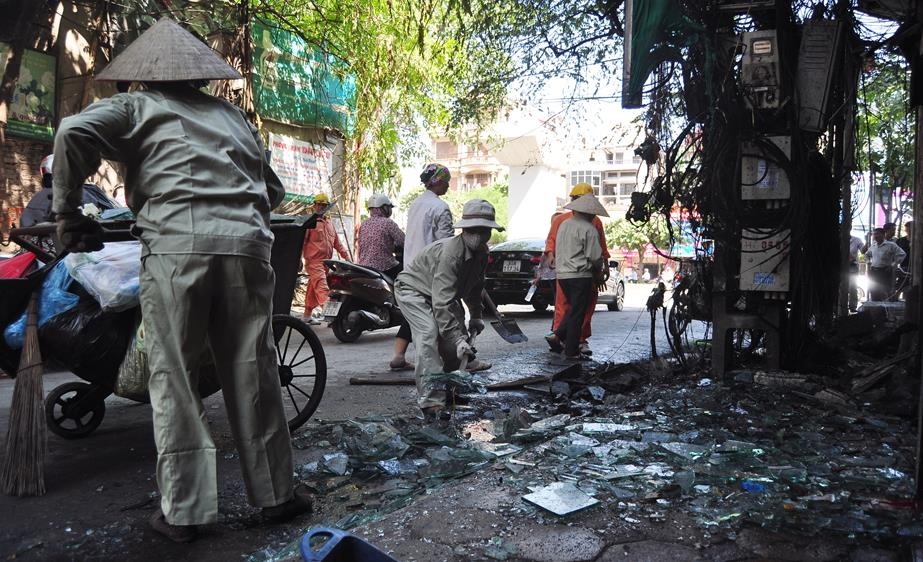 | Sau khi lực lượng chữa cháy khống chế được ngọn lửa, lực lượng vệ sinh tới thu dọn hiện trường. |