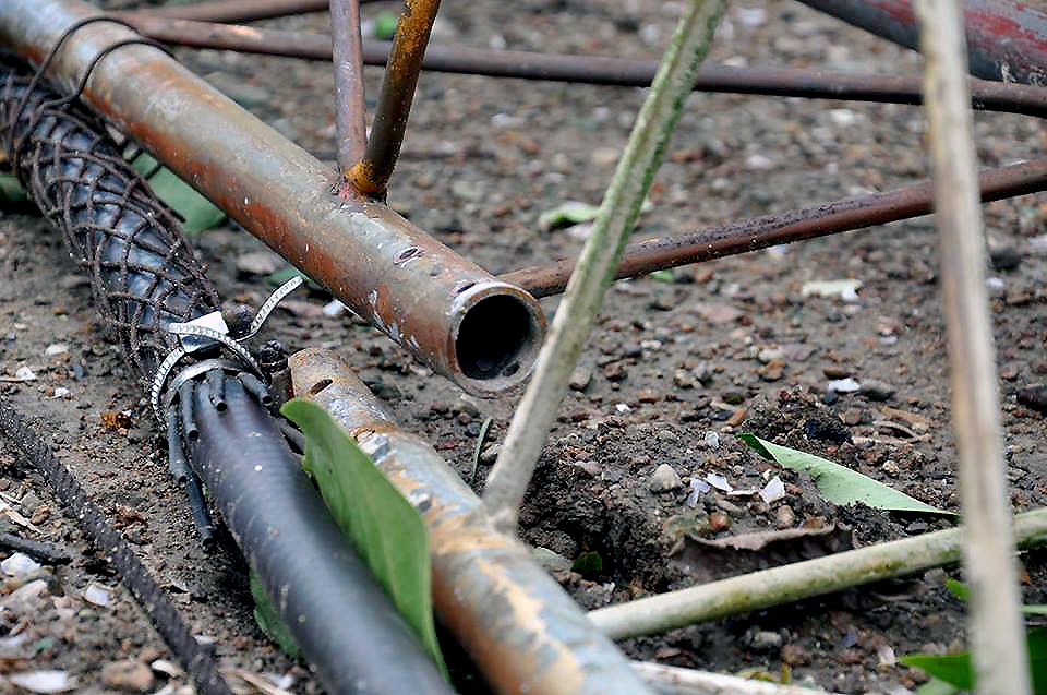 | Tại hiện trường, cột tháp bị quật đổ nằm vắt vẻo từ trạm phủ sóng phát thanh truyền hình sang nhà ông Hạp. |