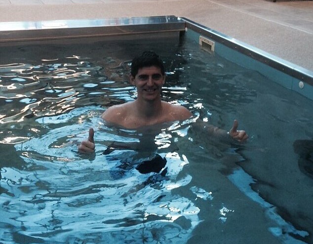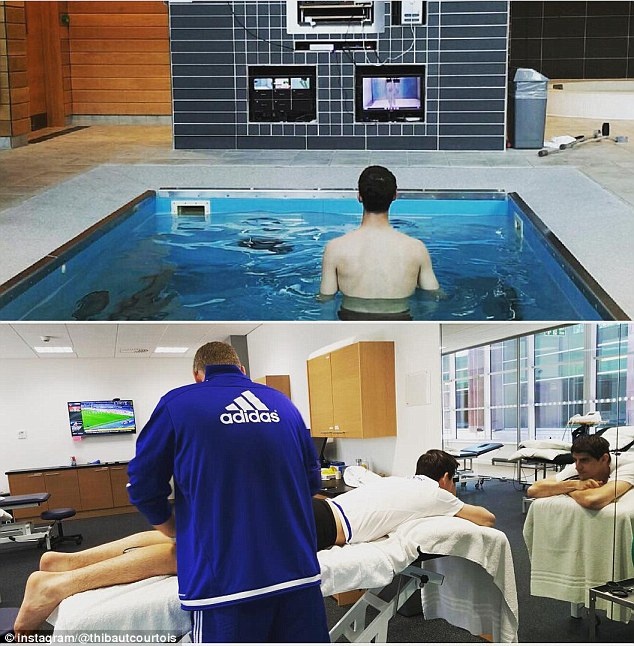 | Trên trang cá nhân Instagram, thủ môn Courtois chia sẻ bức ảnh ở bể bơi trong quá trình điều trị chấn thương đầu gối. |