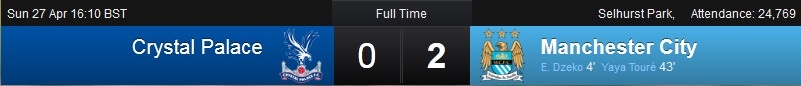 Trận đấu giữa Crystal Palace và Man City đã kết thúc với tỷ số 2-0 nghiêng về đội bóng của HLV Pellegrini.