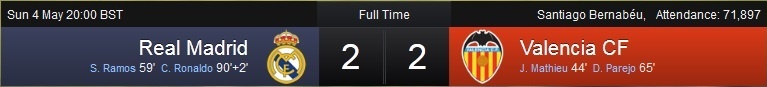 Trận hòa trước Valencia khiến Real mất quyền tự quyết trong cuộc đua tới ngôi vô địch. Hiện tại Kền kền trắng vẫn giậm chân ở vị trí thứ 3 với 83 điểm, kém Barca 2 điểm và Atletico 5 điểm, nhưng chơi kém hơn 1 trận. Nếu đánh bại Valladolid ở trận đấu bù vòng 34, đội thị vệ Hoàng gia sẽ nhảy lên vị trí thứ 2 nhưng vẫn kém Atletico 2 điểm.