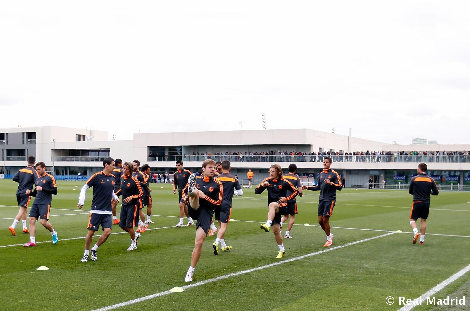 | Cầu thủ Real tập luyện trước sự chứng kiến của người hâm mộ và giới truyền thông. |