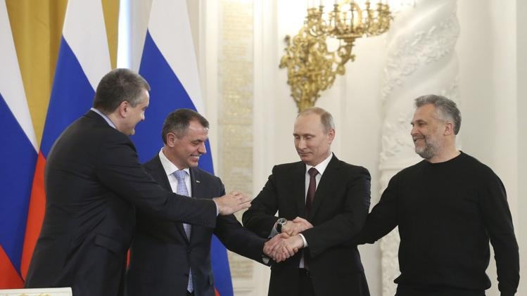 Ông Putin phê chuẩn văn bản có ý nghĩa lịch sử với Thủ tướng Crimea Sergei Aksyonov và các nhà lãnh đạo khác tại Điện Kremlin hôm 18/3.