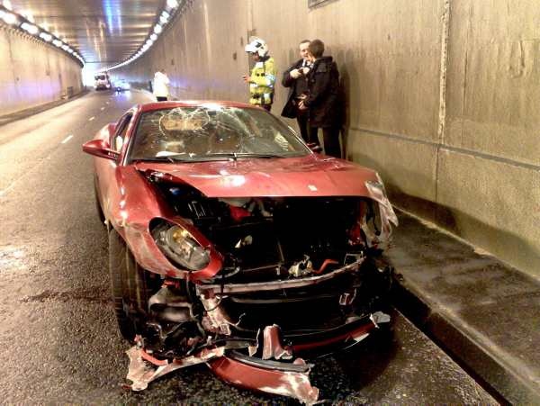 | Chiếc Ferrari của Ronaldo gặp tai nạn trong đường hầm. "Chứng tích" tai nạn của CR7 sau đó được đấu giá với mức khá cao. |