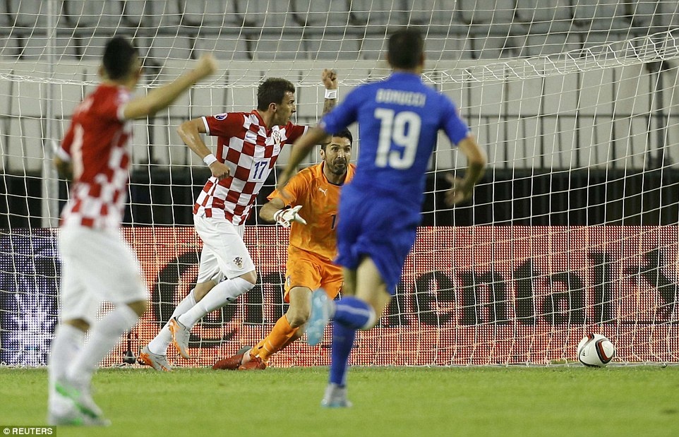 | Các hậu vệ của tuyển Italy có vẻ chủ quan trong tình huống bị dẫn bàn. Cặp trung vệ Bonucci và Astori không theo sát Mandzukic để tiền đạo chủ nhà lặng lẽ thoát xuống sút tung nóc lưới. |
