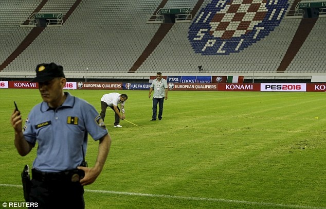 | Ban tổ chức buộc phải vào sân để xóa những dấu vết trong giờ nghỉ giải lao. Liên đoàn bóng đá Croatia (HNS) sau đó lên tiếng xin lỗi về vụ việc này. |