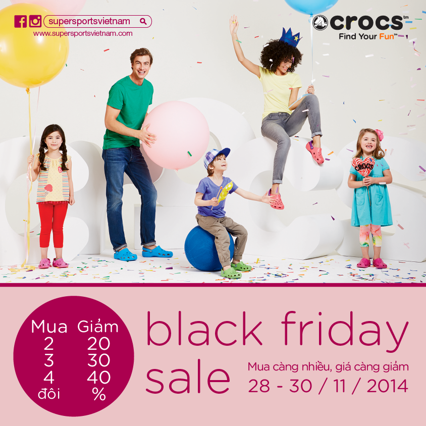 Tại nhiều cửa hàng và trung tâm thương mại, các chương trình khuyến mãi với nhiều quà tặng và ưu đãi giảm giá đã bắt đầu. Dịp này, nhãn hiệu Crocs của tập đoàn Central Retail sẽ tập hợp những bộ sưu tập, những sản phẩm nổi bật và giới thiệu với khách hàng chương trình khuyến mãi đặc biệt: Black Friday - mua càng nhiều, giá càng giảm.