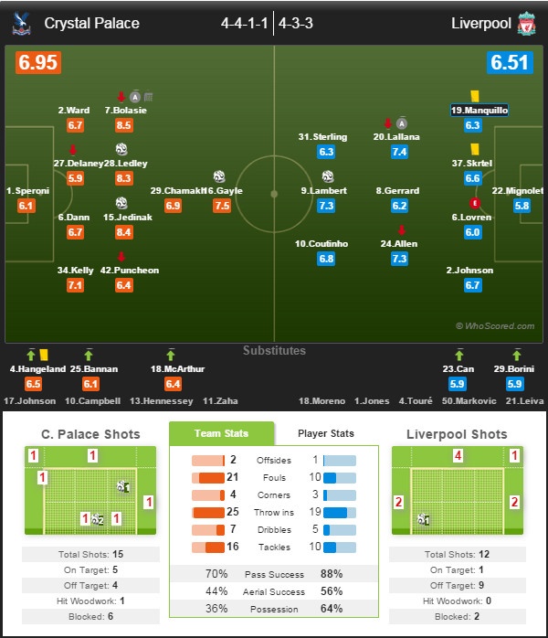 Bằng quyết tâm của một đội bóng bị dồn vào thế chân tường (xếp áp chót BXH), Crystal Palace tràn lên tấn công mạnh mẽ với hai hạt nhân chính trên hàng công là Bolasie và Gayle. Chính bộ đôi này đều để lại dấu giầy trong cả hai bàn thắng đầu tiên cho đội chủ nhà ở các phút 17 và 78 trước khi đội trưởng Jedinak tung cú sút phạt đẳng cấp kết liễu số phận đội khách ở phút 81.