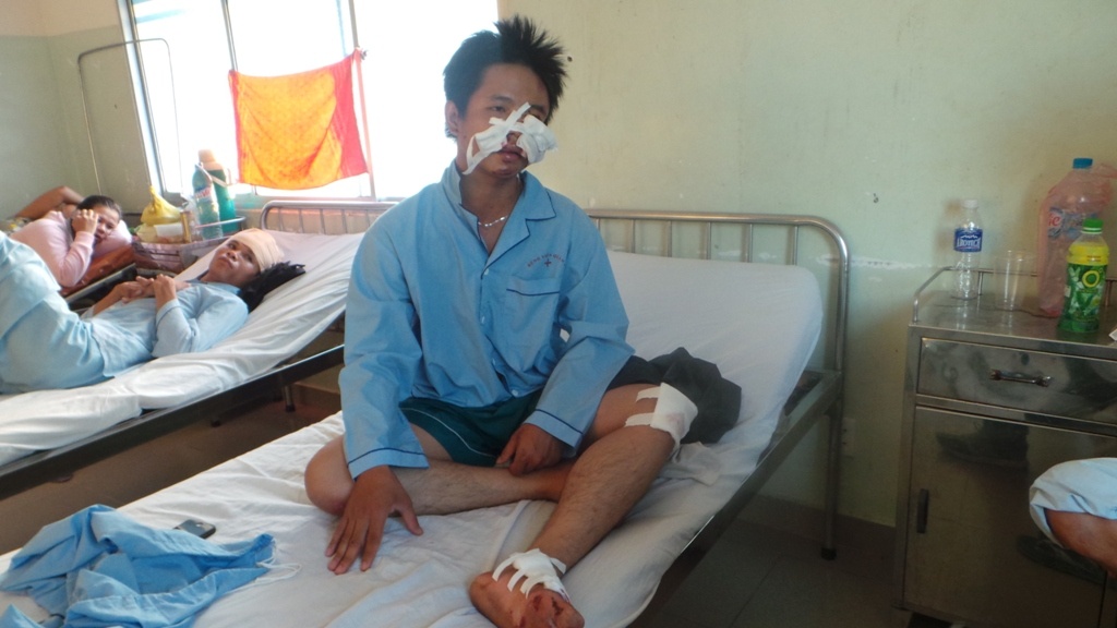 Nạn nhân nhập viện trong tình trạng phần mặt bị hai vết rách phải khâu 8 mũi, phần trán bị sưng, tay và chân có nhiều vết trầy xước.