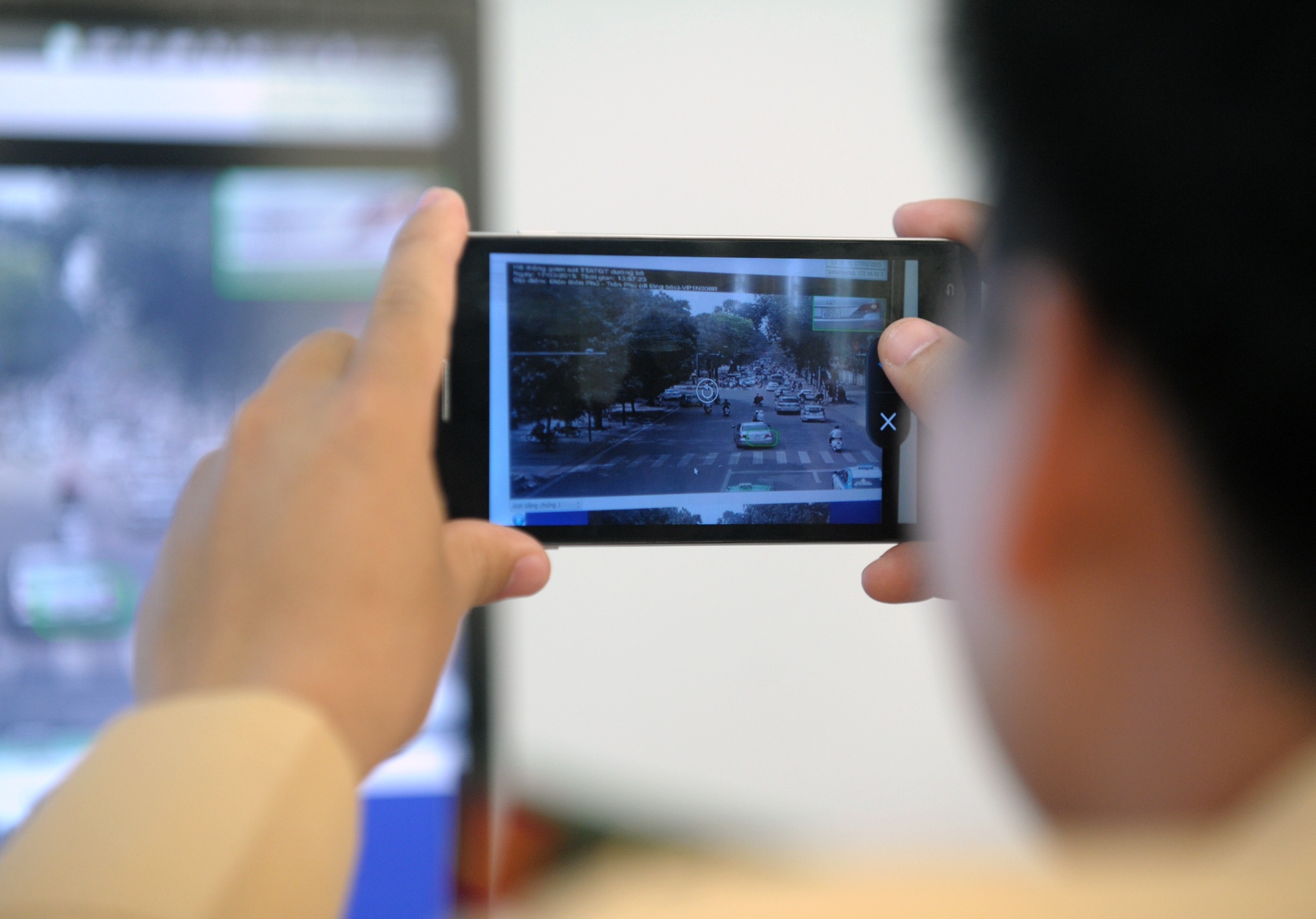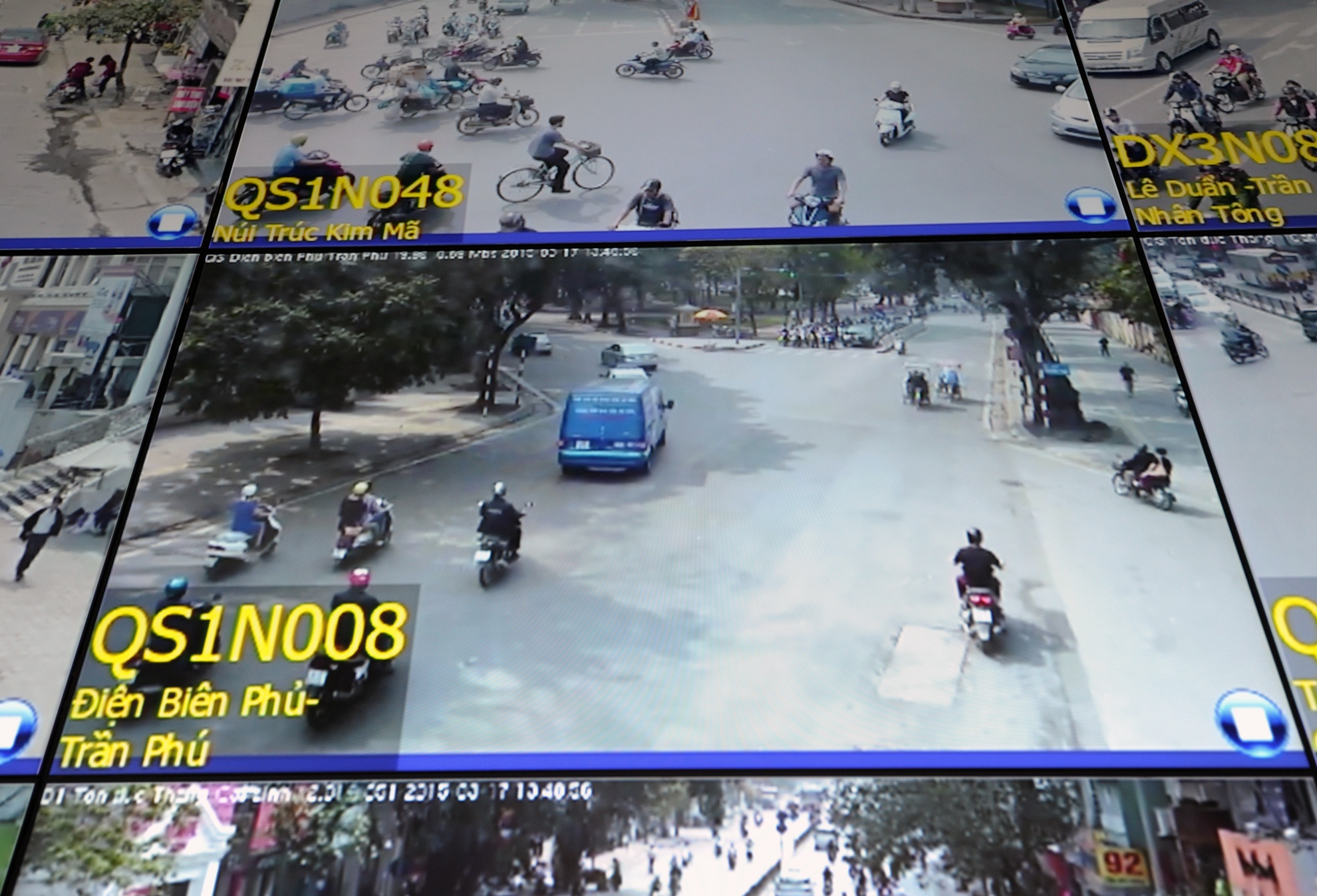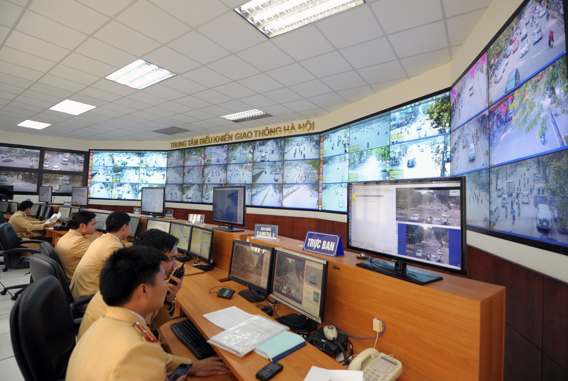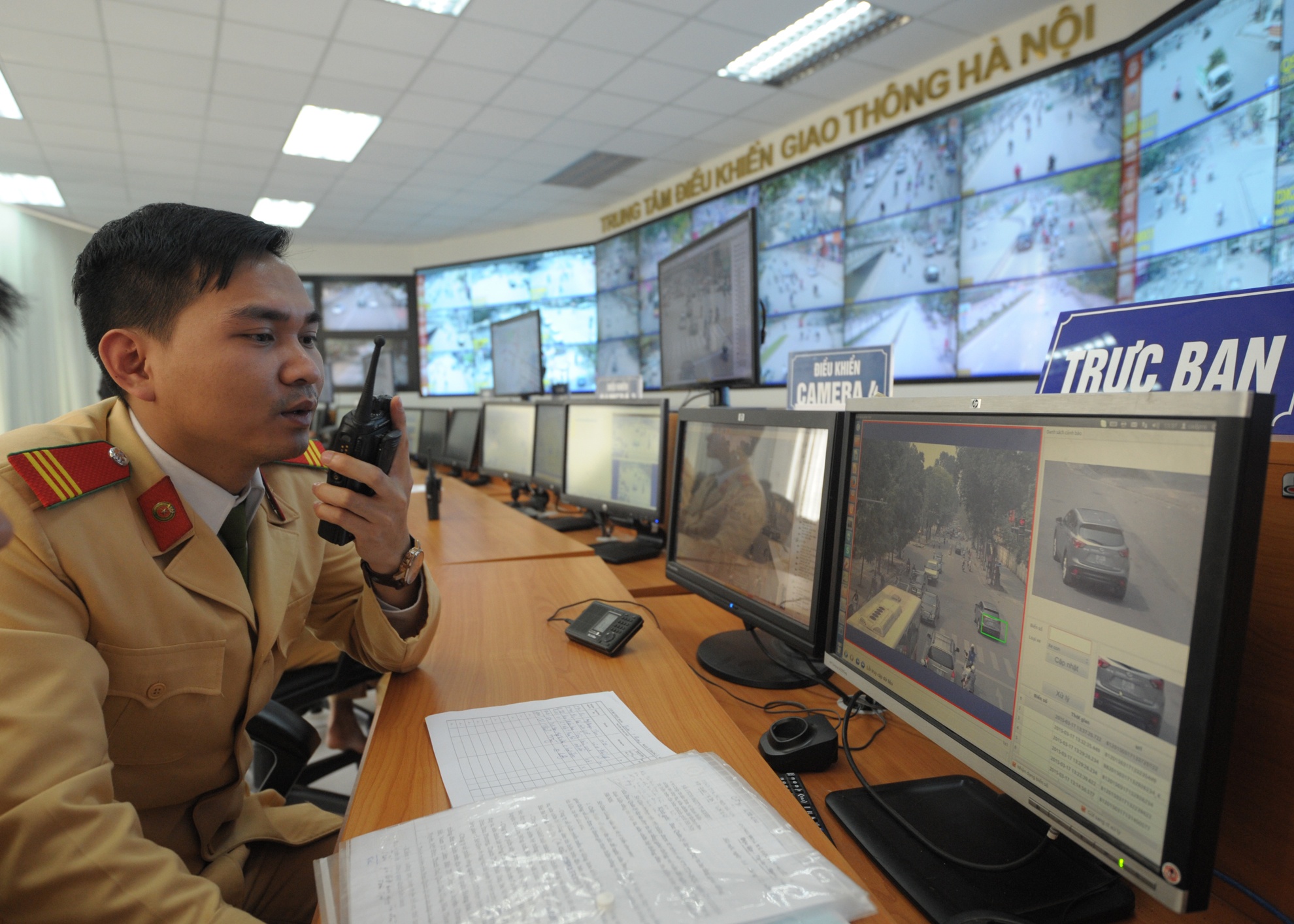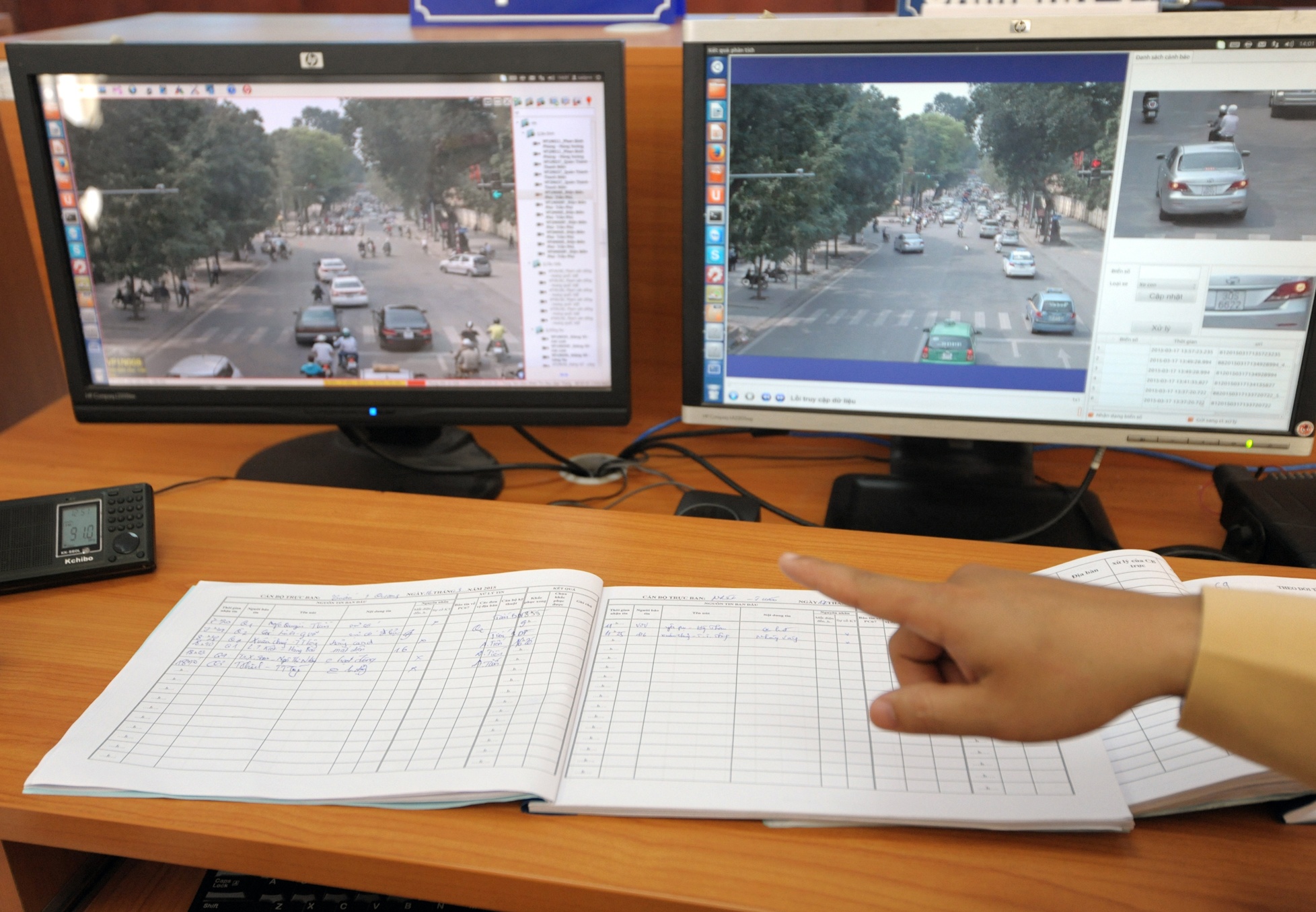 | Hình ảnh tại trung tâm điều khiển giao thông Hà Nội, nơi kết nối với 360 camera theo dõi giao thông ở các ngã tư lớn, trong đó 78 chiếc ghi lại được hình ảnh rõ nét biển kiểm soát phương tiện vi phạm tại các nút trọng điểm. |