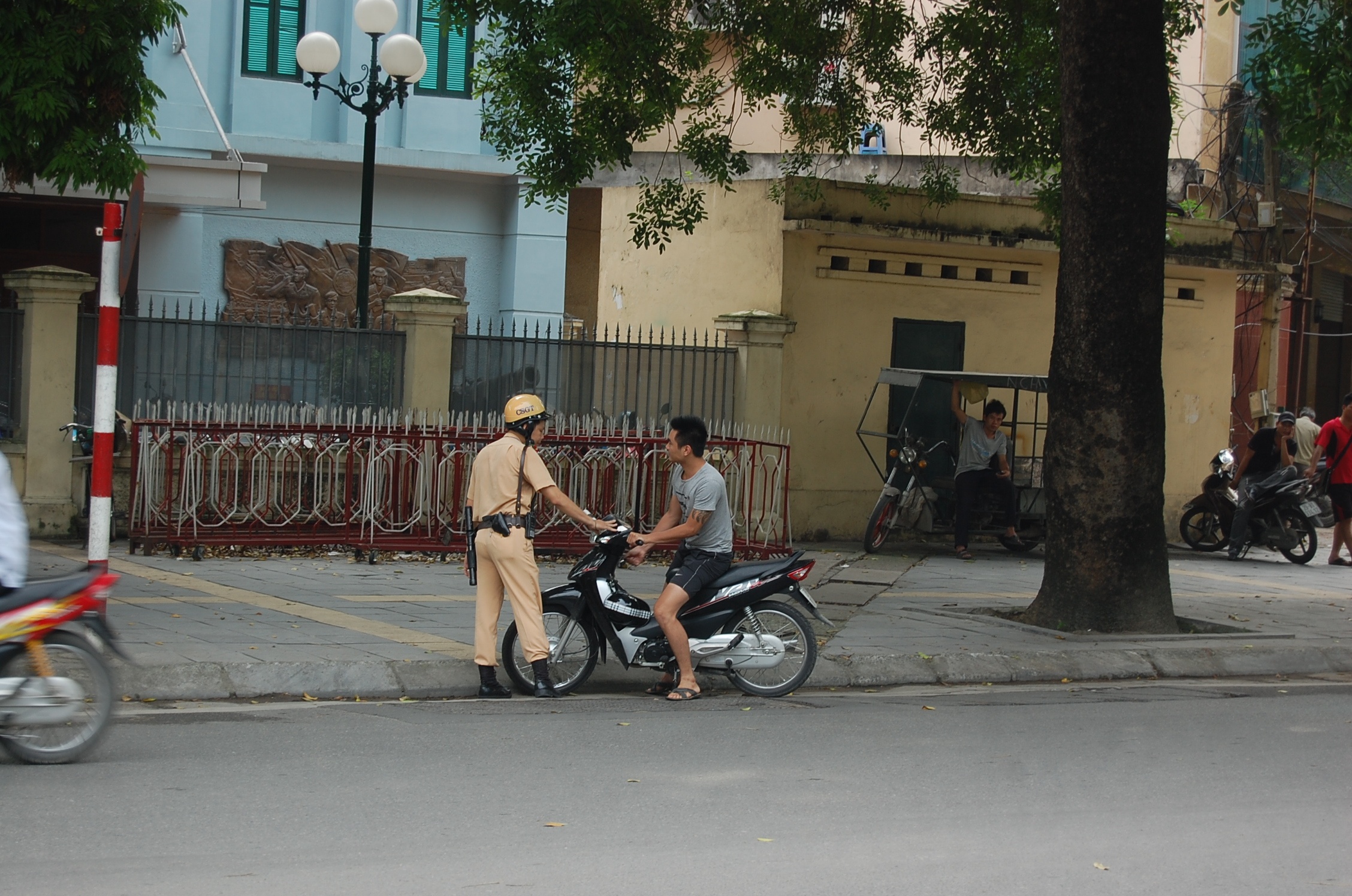 | CSGT tiến hành xử lý thanh niên vi phạm giao thông trong sáng 15/8. |