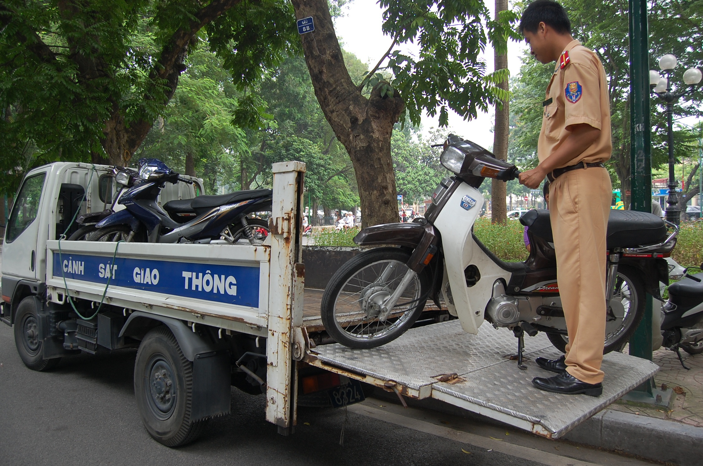 | Xe vi phạm được cho lên thùng đưa về trụ sở công an. |