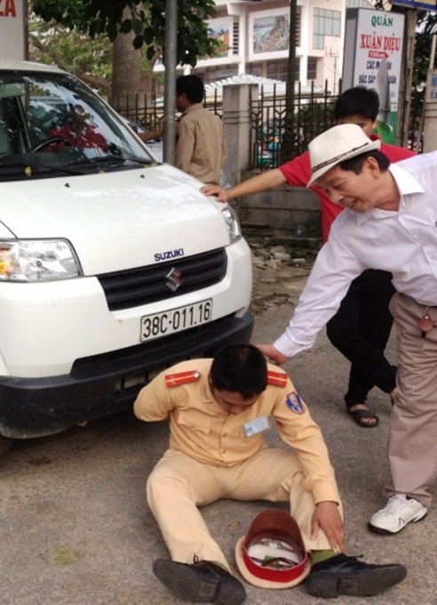 Trung úy Trần Xuân Hà, thuộc Công an TP Hà Tĩnh, cho biết: “Phát hiện hai chiếc xe của Công ty TNHH điện tử Ông Nhận vi phạm giao thông, chúng tôi đã tiến hành yêu cầu chủ phương tiện xuất trình giấy tở để xử lý. Không những không hợp tác, ông Nhân, chủ doanh nghiệp còn chửi mắng, lái xe đâm vào khiến tôi ngã xuống dưới gầm xe và bị thương”.