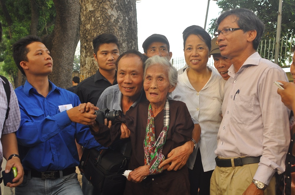 | Một người dân vào viếng xúc động ôm lấy cụ. Nước mắt của bà cụ 110 tuổi khiến nhiều người rơi lệ. |