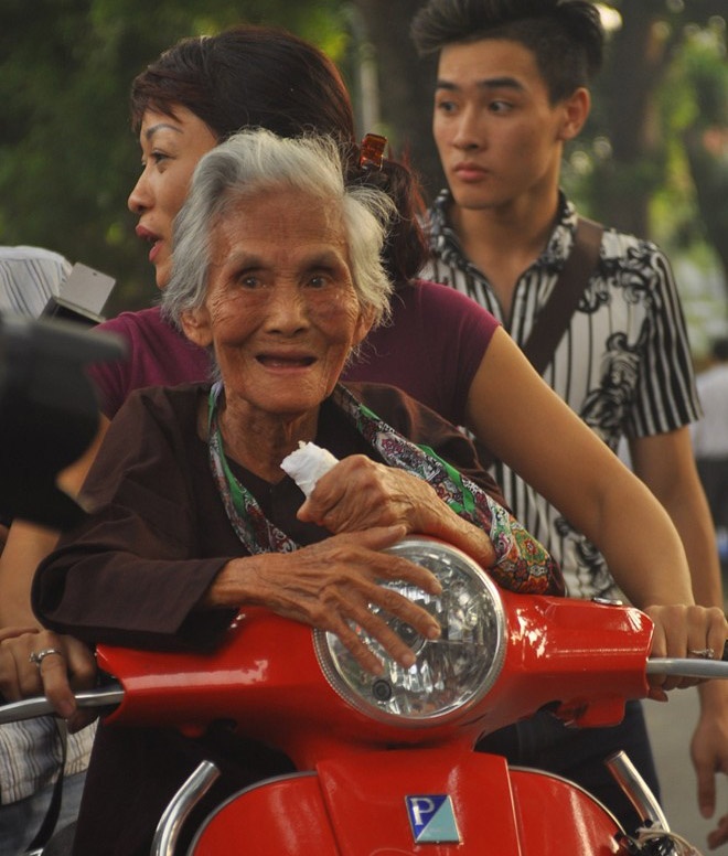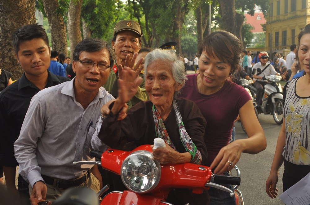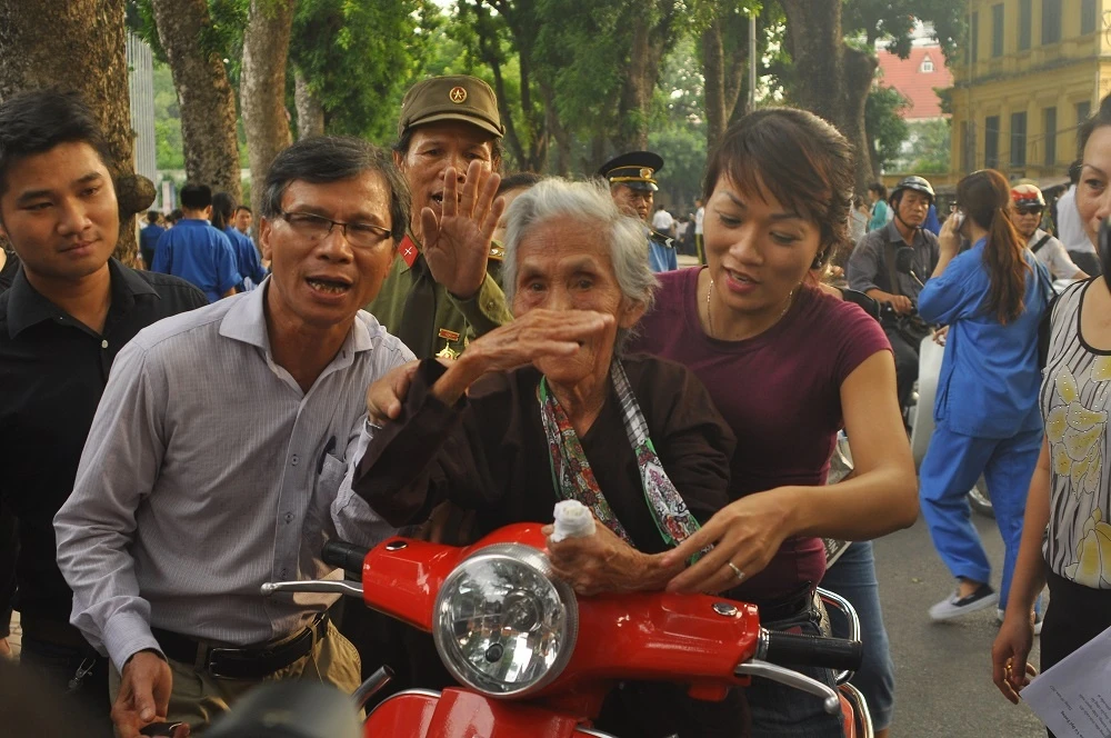Hôm nay chị Hà đưa cụ bằng xe máy đến viếng thăm Đại tướng. Người dân, thanh niên tình nguyện cùng lực lượng CSCĐ giúp cụ di chuyển.