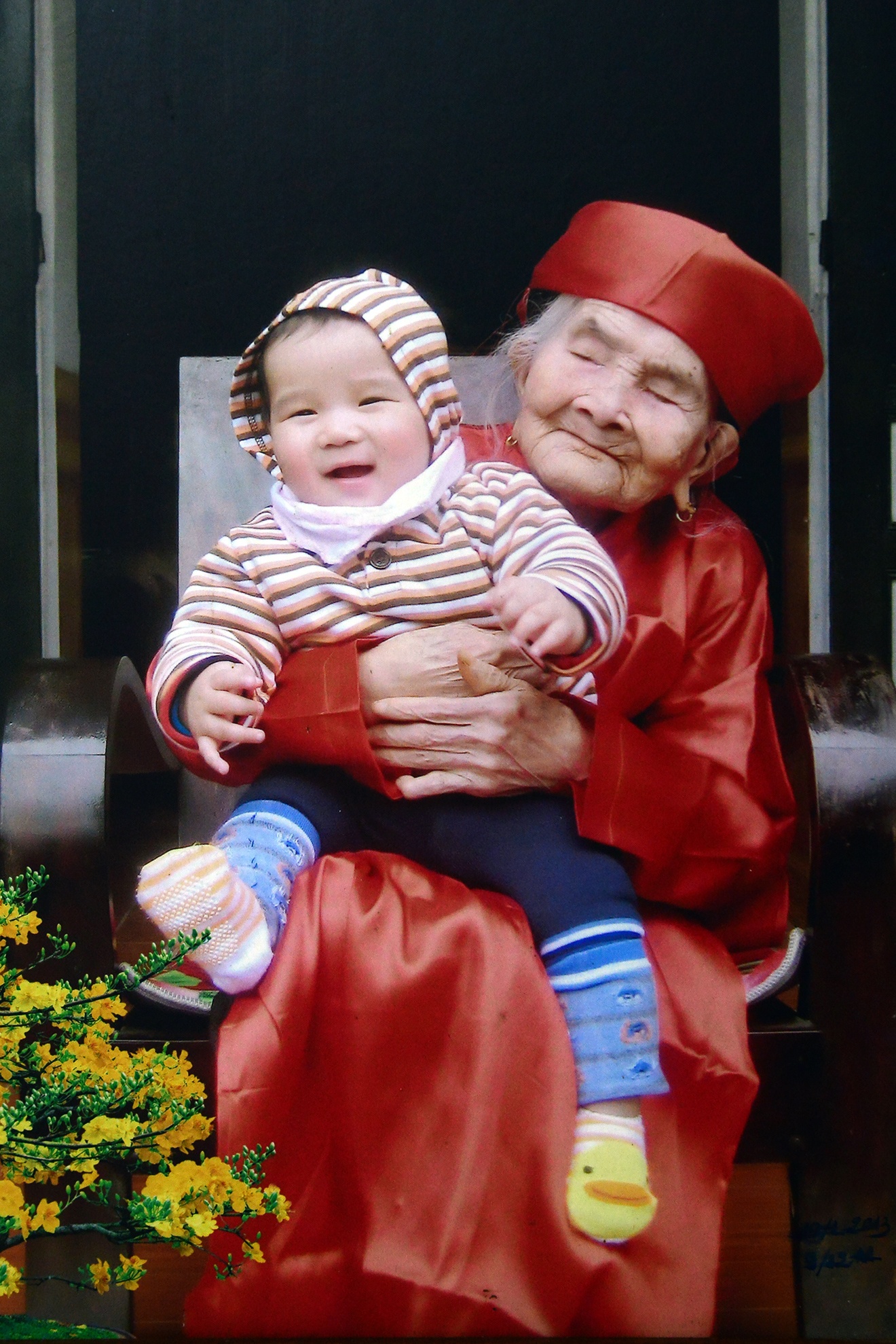 Cụ Chạo bế chít ngoại mới được hơn 1 tuổi. Gia đình cụ hiện có 6 thế hệ con cháu cùng chung sống.