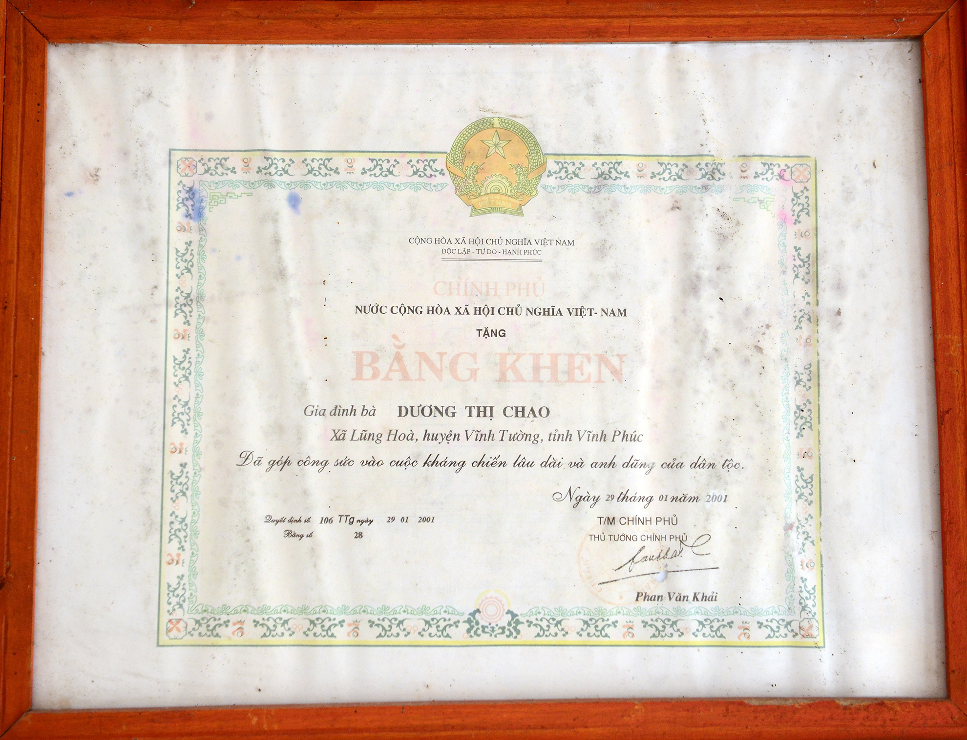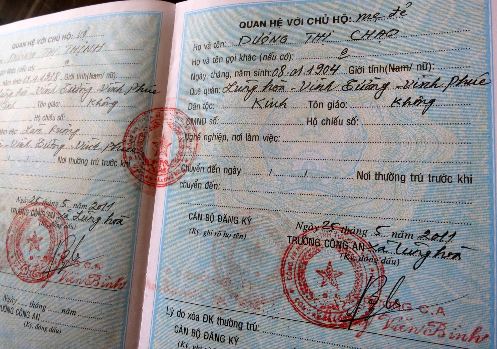 Giấy khai sinh từ thời phong kiến và chứng minh thư của cụ đã mất từ lâu. Trên sổ hộ khẩu, cụ Chạo được xác nhận sinh năm 1904 và năm nay tròn 110 tuổi, là một trong số 5 người cao tuổi nhất Việt Nam còn sống.