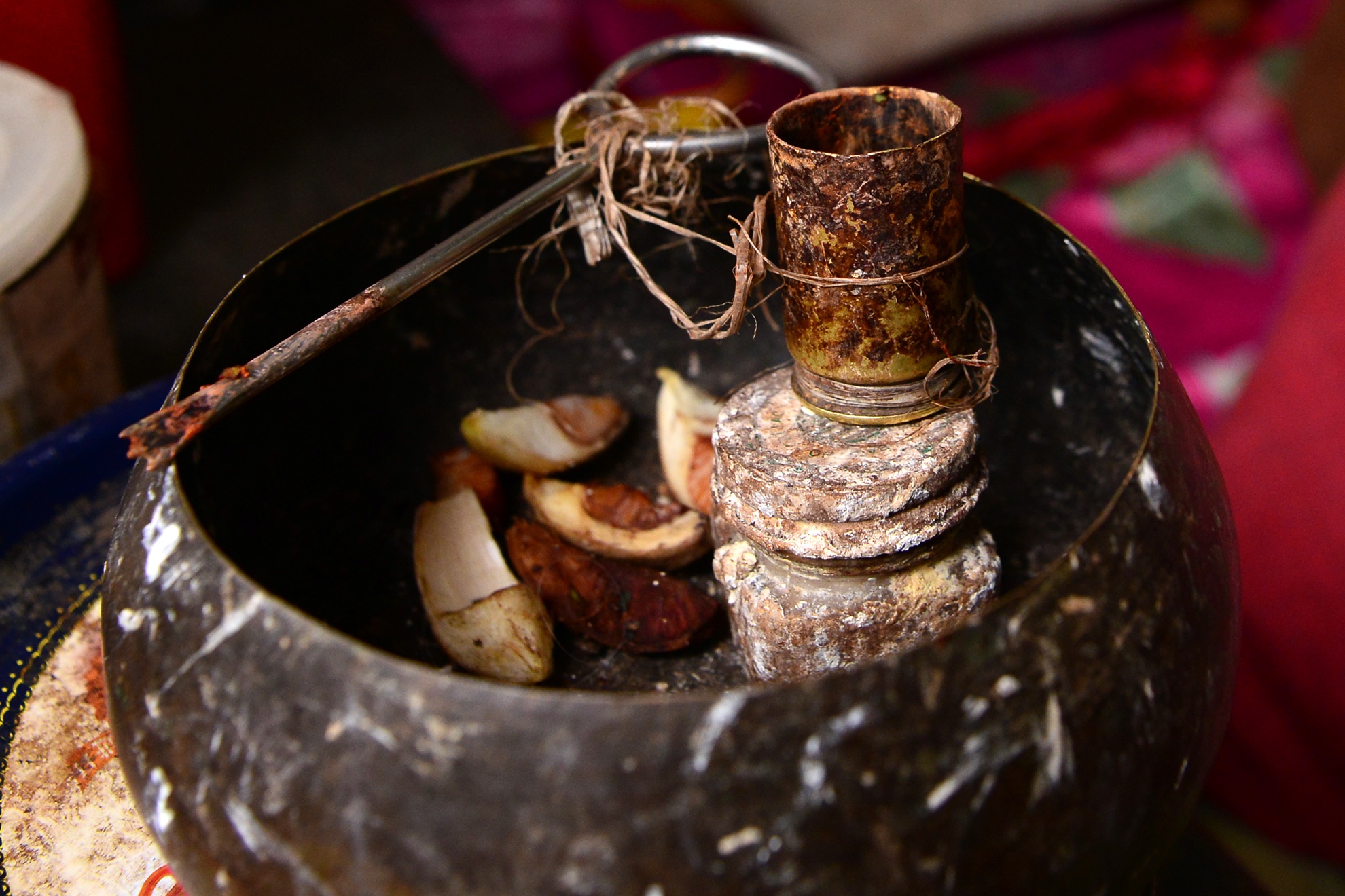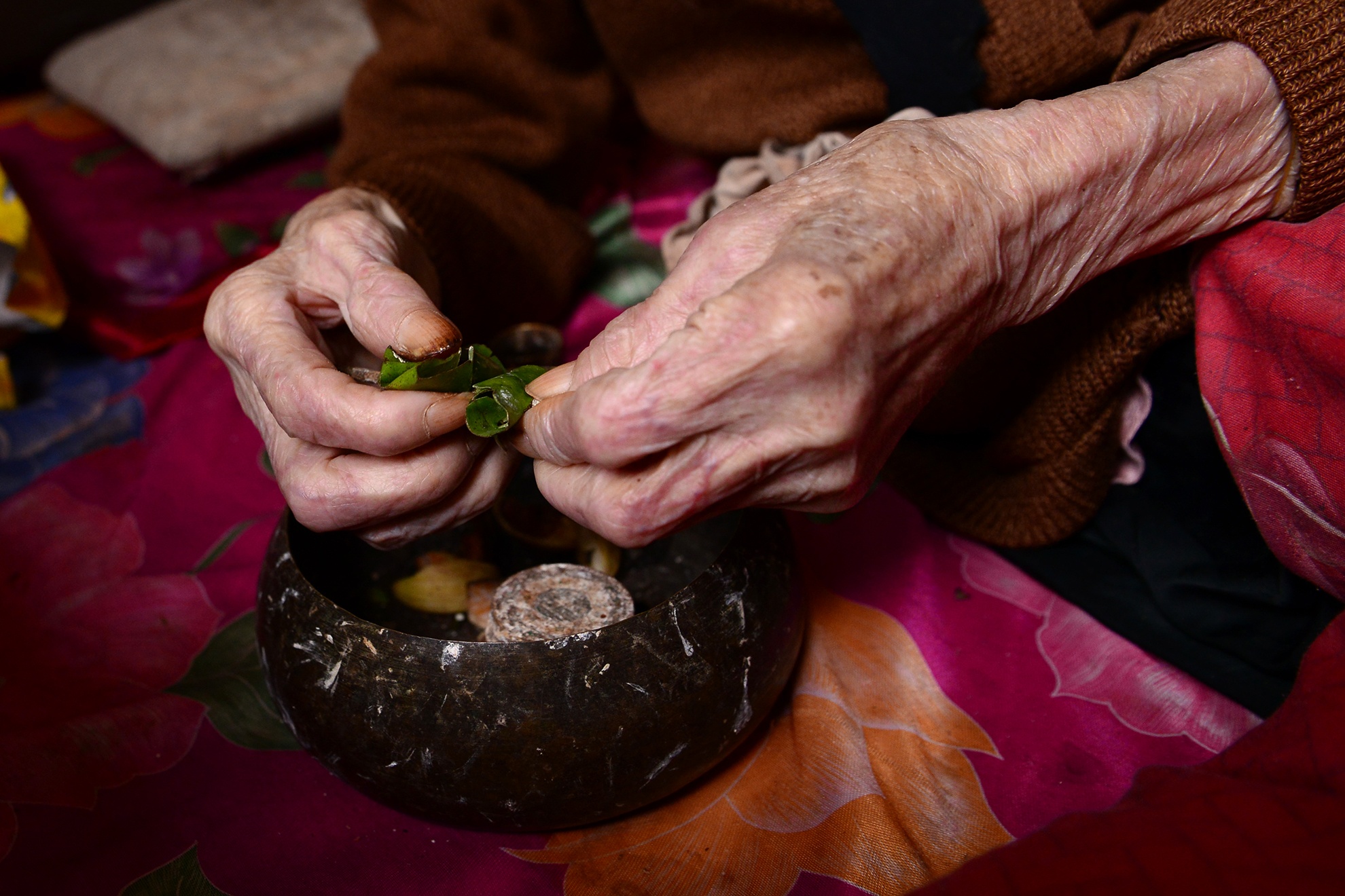 20 năm nay cụ không còn chiếc răng nào nên mỗi khi ăn cụ lại tự tay mình "ngoáy trầu" bằng chiếc dùi cùng chiếc cối giã nhỏ làm bằng vỏ đạn cắt đôi.