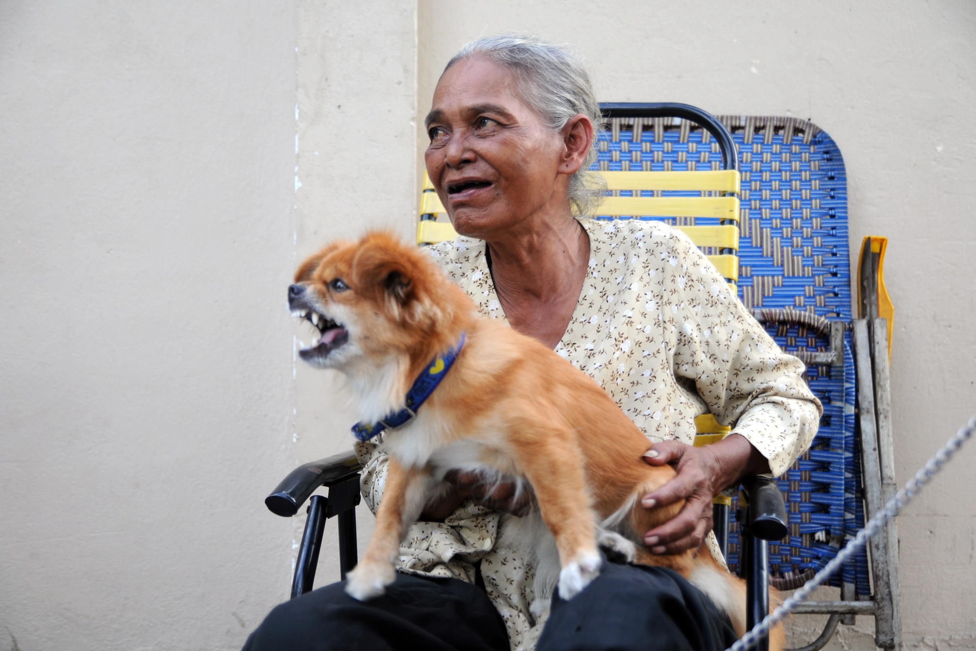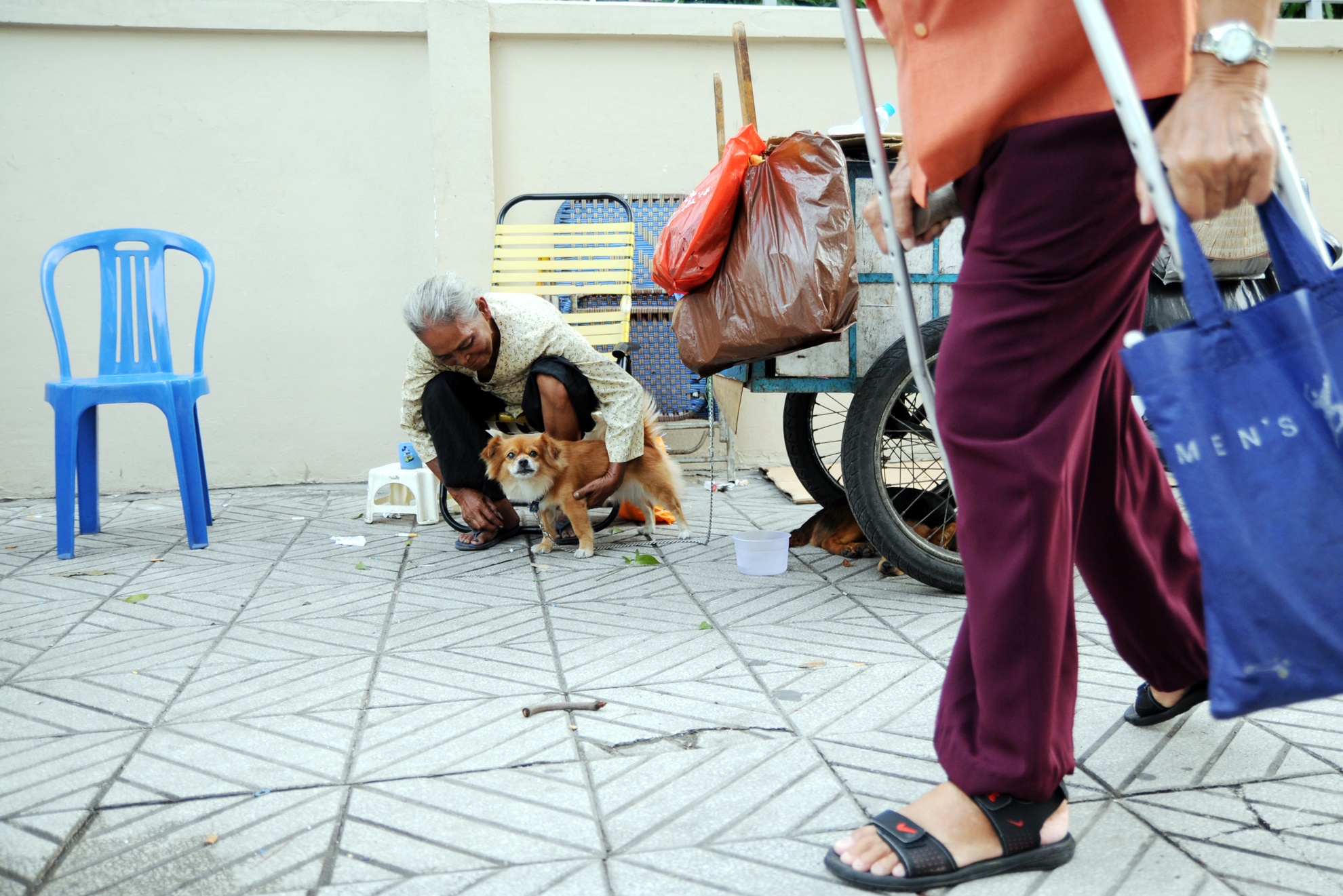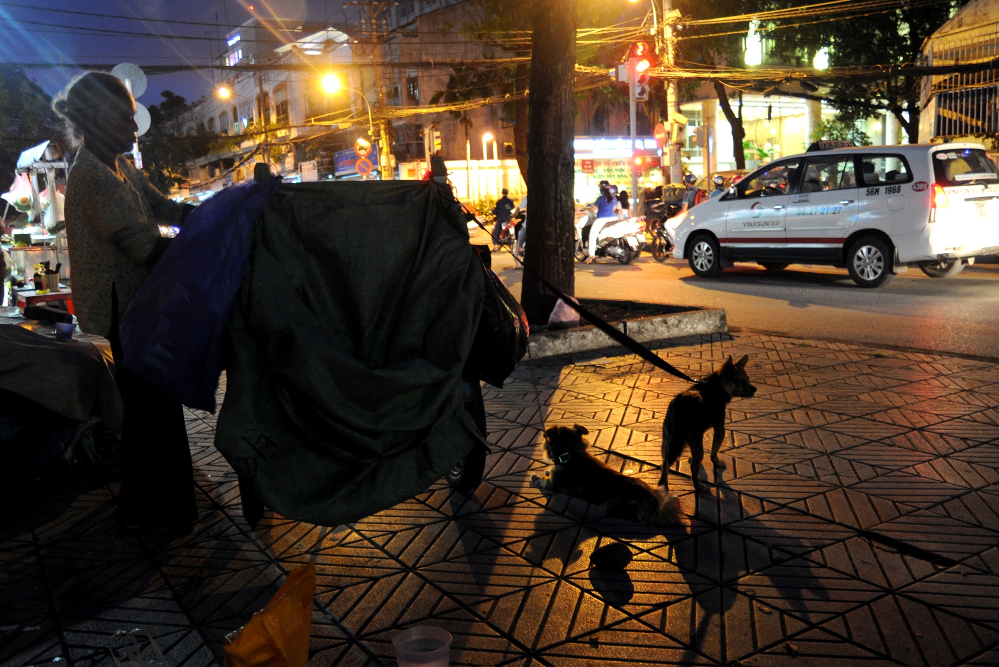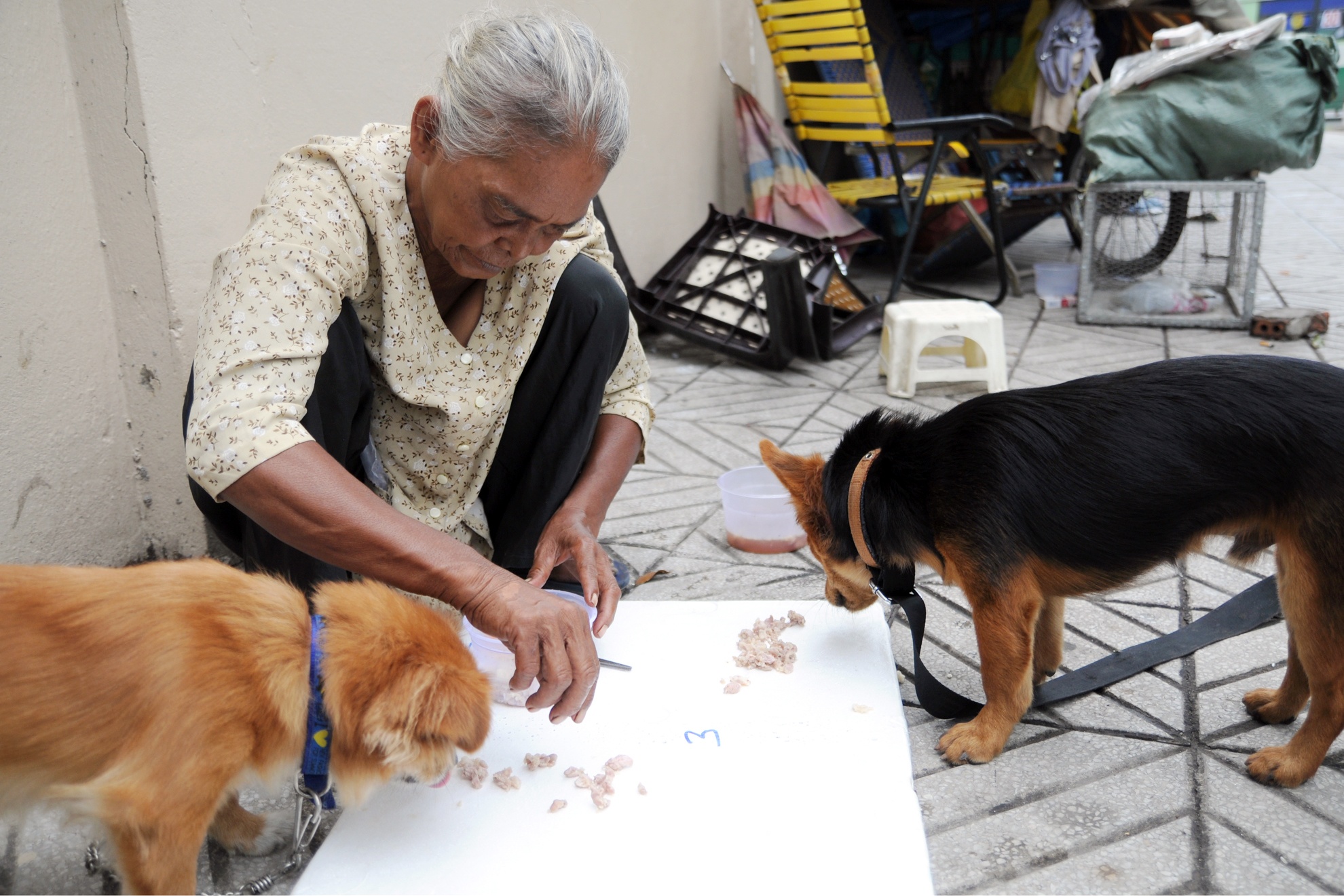 | Hai chú chó thường xuyên vây quanh người phụ nữ già là do một nhà hàng gần đó biếu để bà bầu bạn cho đỡ buồn. |