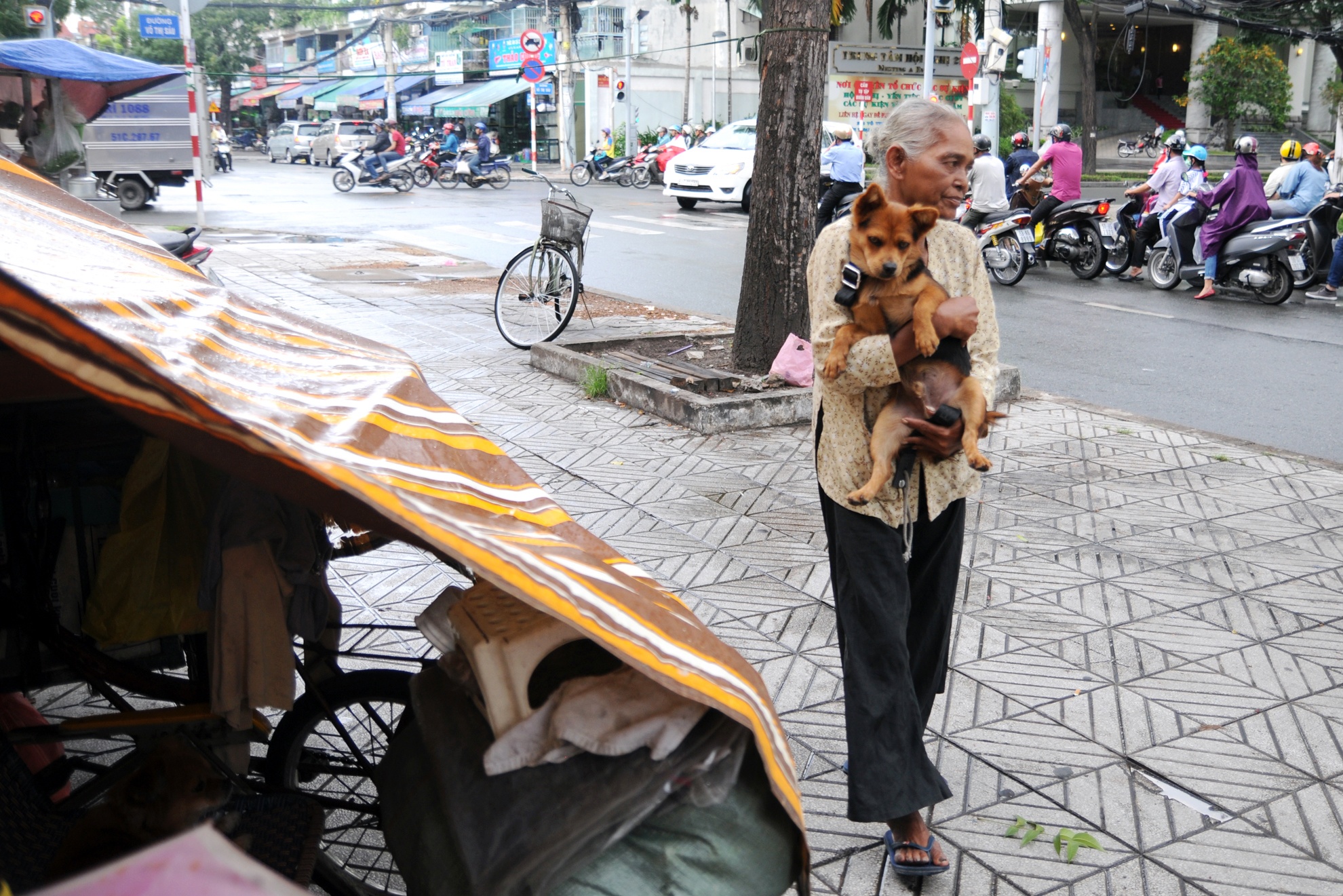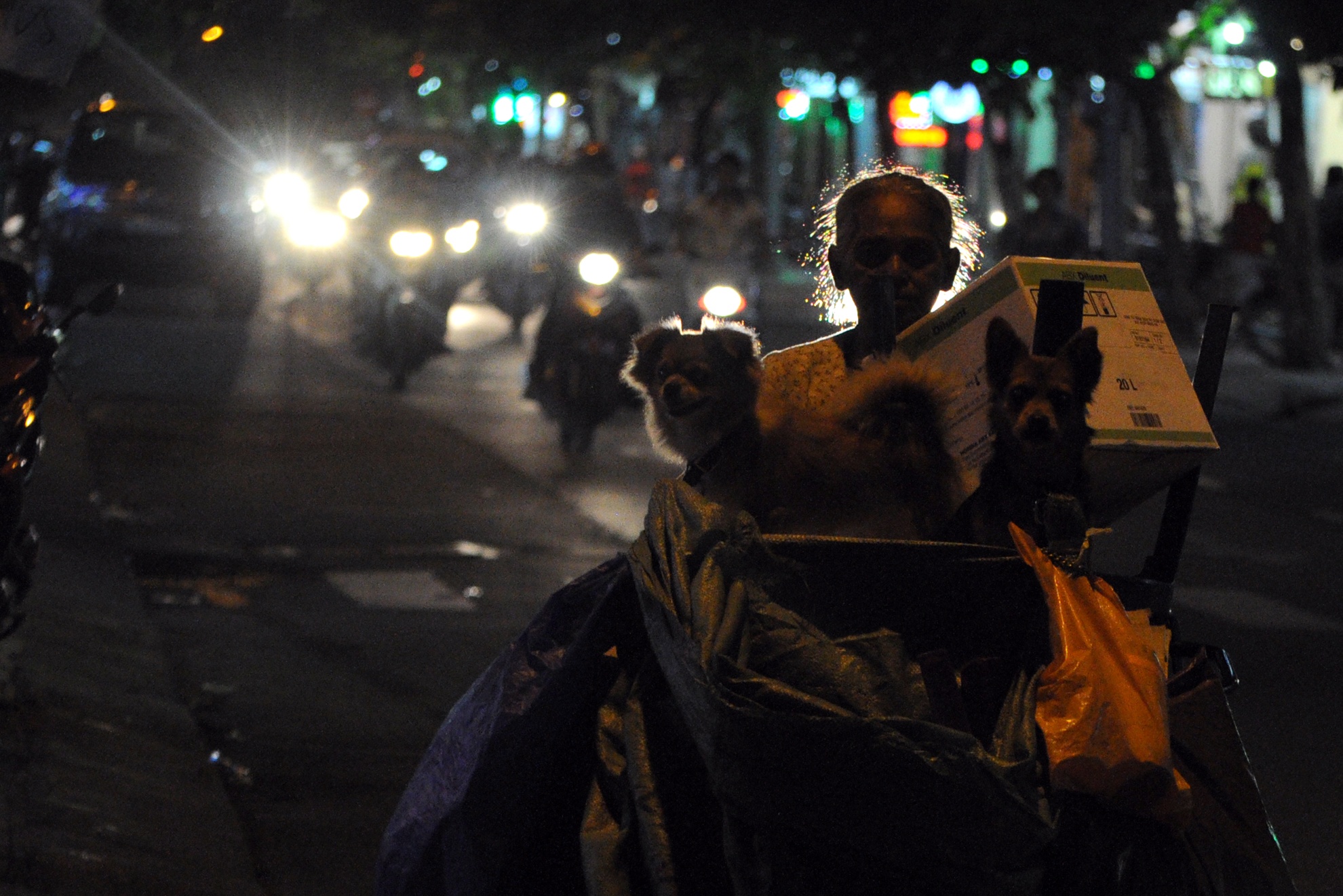 | Bị bệnh khớp, đi lại không khỏe nên bà Trinh chỉ lượm ve chai ở khu vực quận 3, gần chỗ ở. Hai chú chó nhỏ ngồi lên thùng xe ba gác rong ruổi cùng. Công việc của bà bắt đầu vào lúc sẩm tối, và kết thúc khi mặt trời đã ló rạng. |