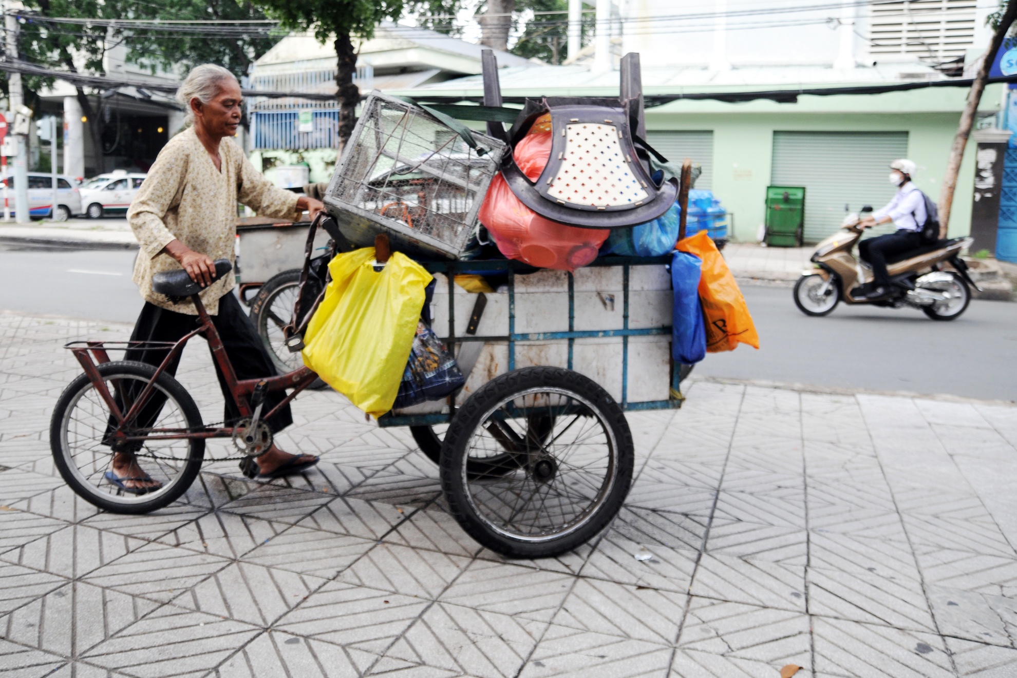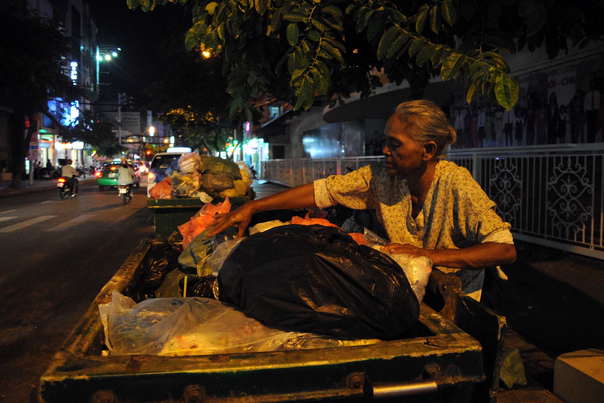 | Nhiều lúc đi lượm khuya, nhiều người thường cho bà mớ chai nhựa hay bìa các tông để xe hàng nhanh đầy còn về nghỉ sớm. |