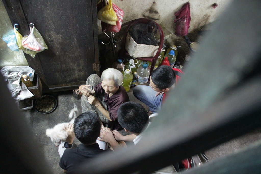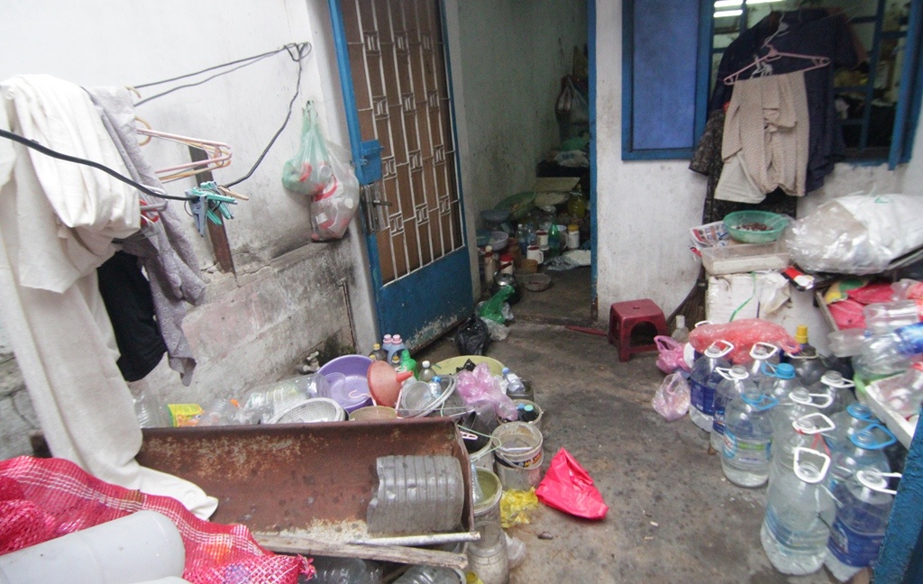 Căn nhà cụ Quý nằm sâu trong hẻm, bên trong xập xệ, ngổn ngang chai lọ, cơm khô cùng một mùi ẩm thấp khó chịu.