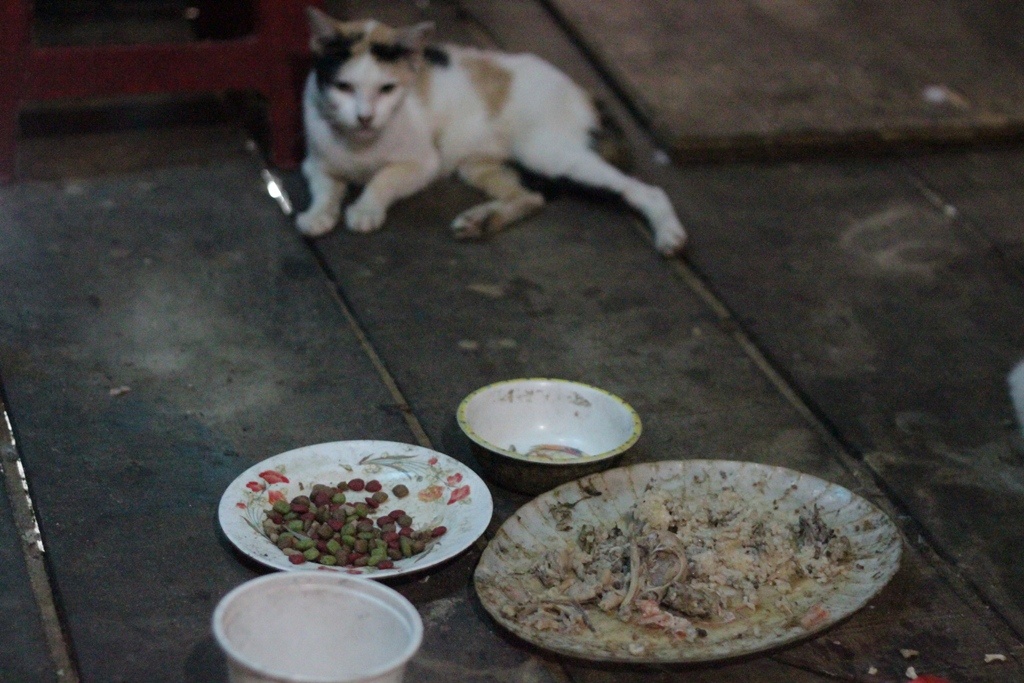 | Ngay cả phần cơm trưa, ngày nào cụ cũng dành một ít cho các con mèo hoang sống trong chợ. "Mỗi ngày tôi chỉ ăn một bữa cơm, nếu tối đói quá thì nấu gói mì tôm. Gạo, thức ăn mua về nhà chỉ dành cho mèo", cụ Quý cho biết. |