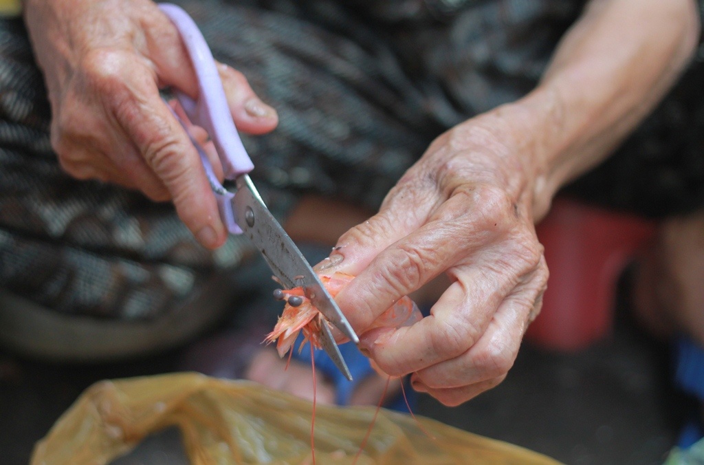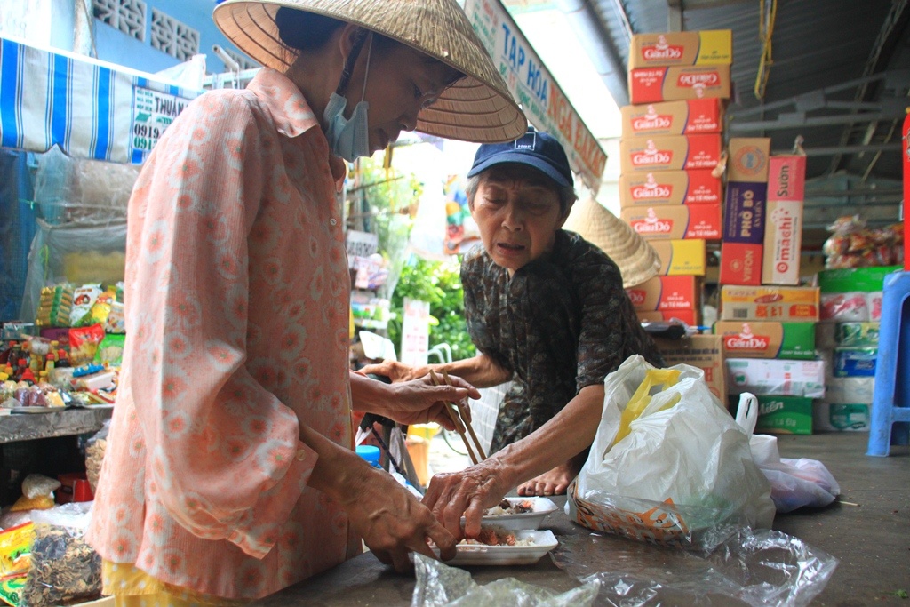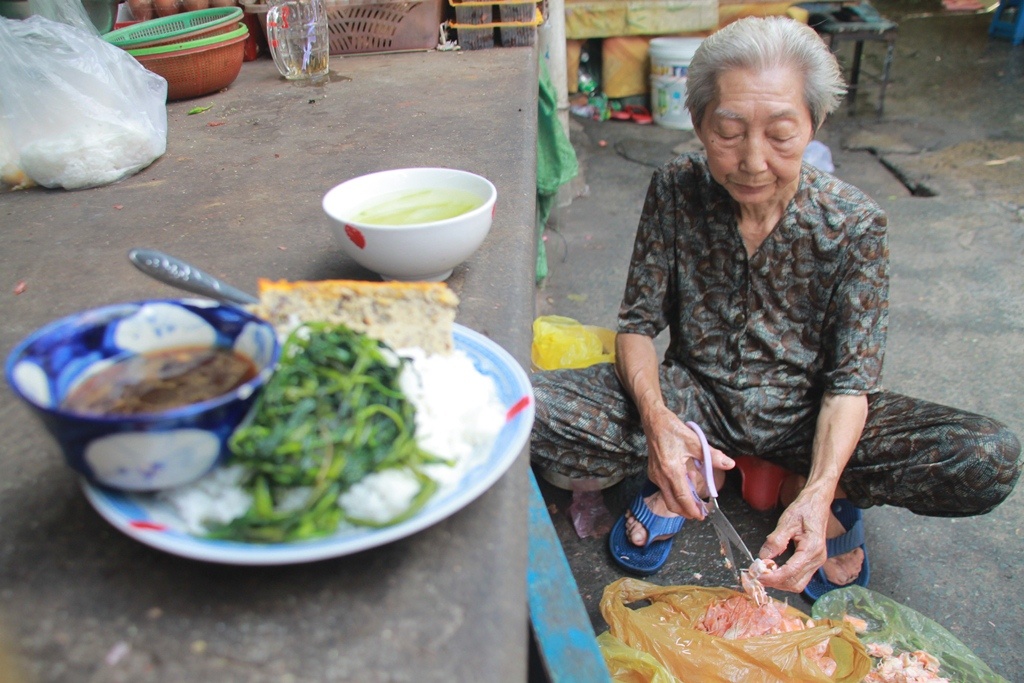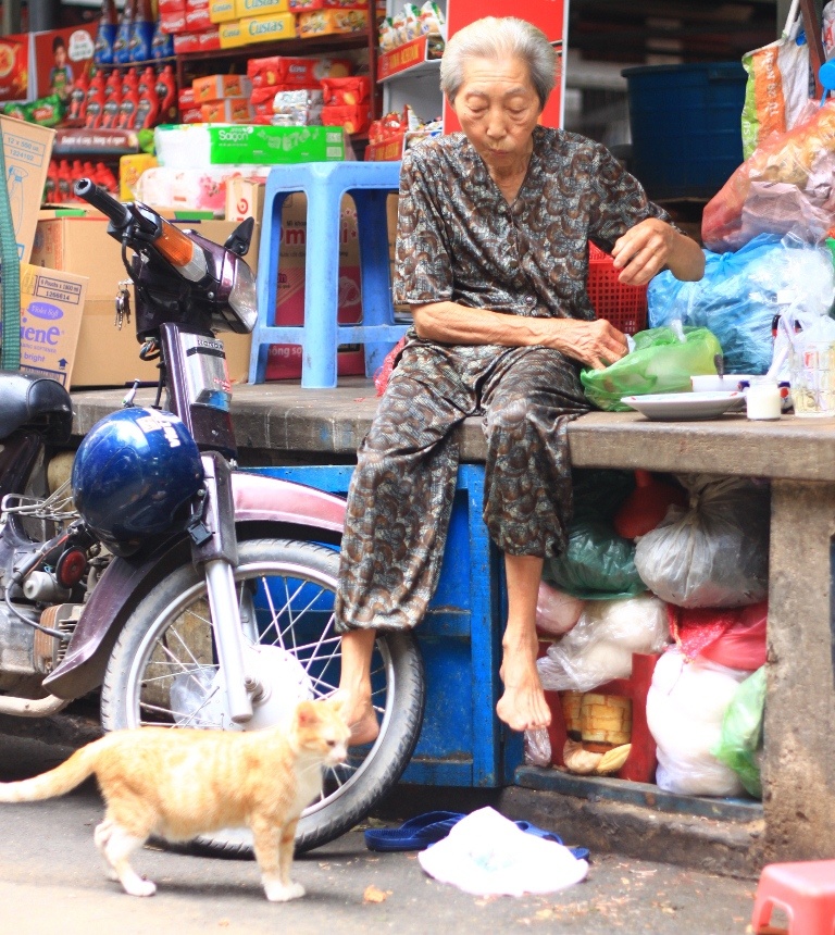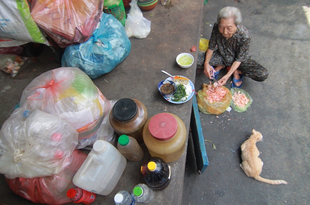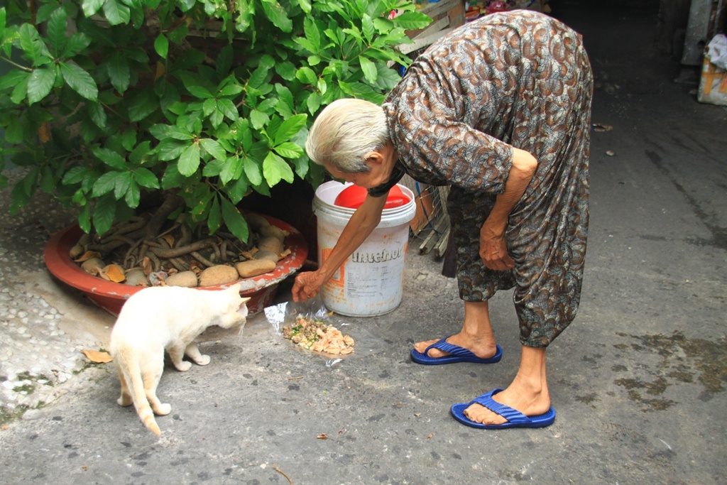 | Khoảng 10 giờ sáng, cụ nghỉ bán, rồi đi xin đầu tôm ở những cửa hàng thức ăn quanh chợ để cho mèo ăn. |