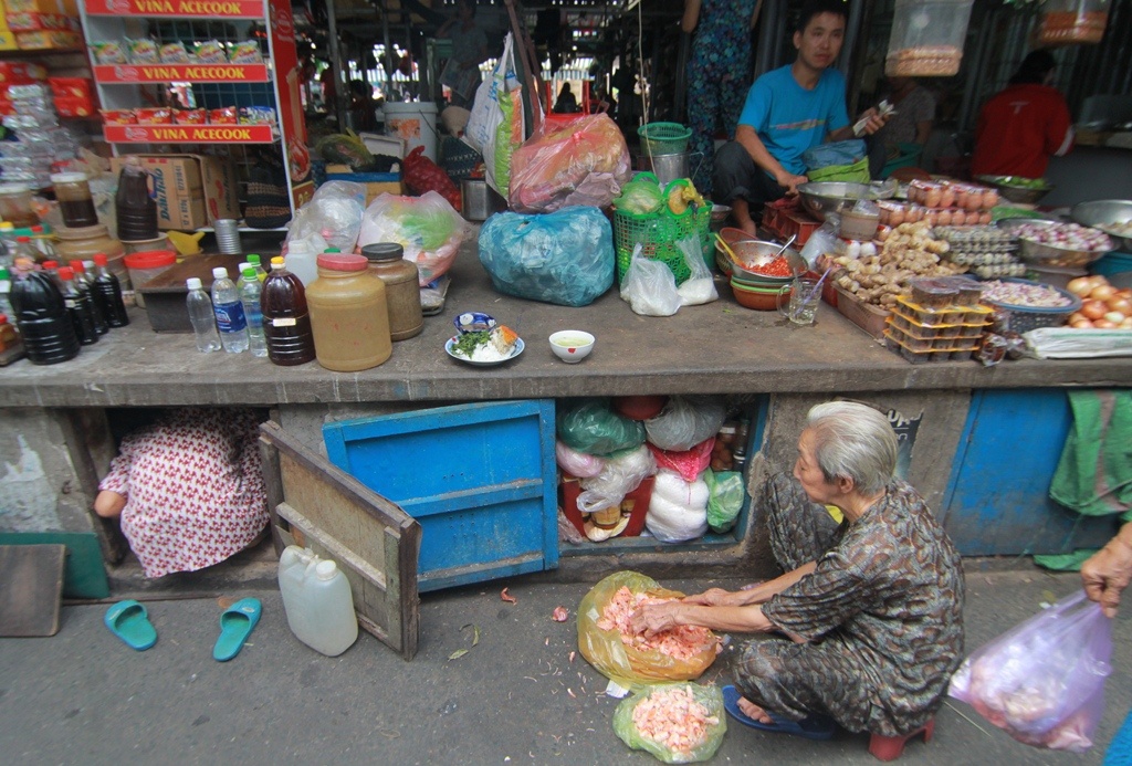 | Cụ bà Lê Thị Quý (80 tuổi) đang bán hàng tại chợ Đa Kao (quận 1, TP.HCM). Tiểu thương tại đây quen gọi là "cụ Quý mèo hoang". |