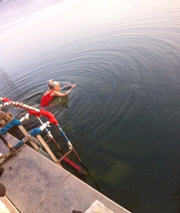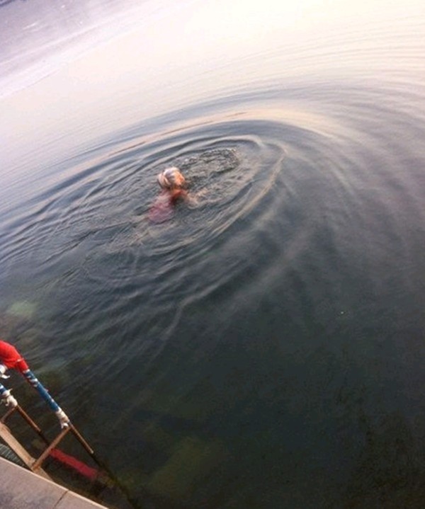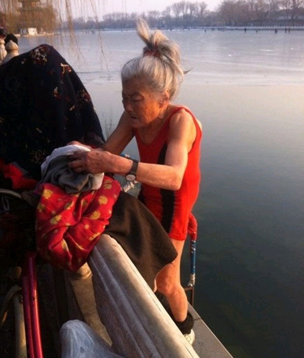 Mọi sự chú ý lập tức đổ dồn vào cụ bà khi cụ từ tốn cởi bỏ lớp quần áo ấm, trên người chỉ mặc một chiếc áo bơi liền thân màu đỏ nhẹ nhàng nhảy xuống nước. Mái tóc bạc trắng được buộc cao một cách gọn gàng. Thân hình nhỏ nhắn trông rất nhanh nhẹn, săn chắc.