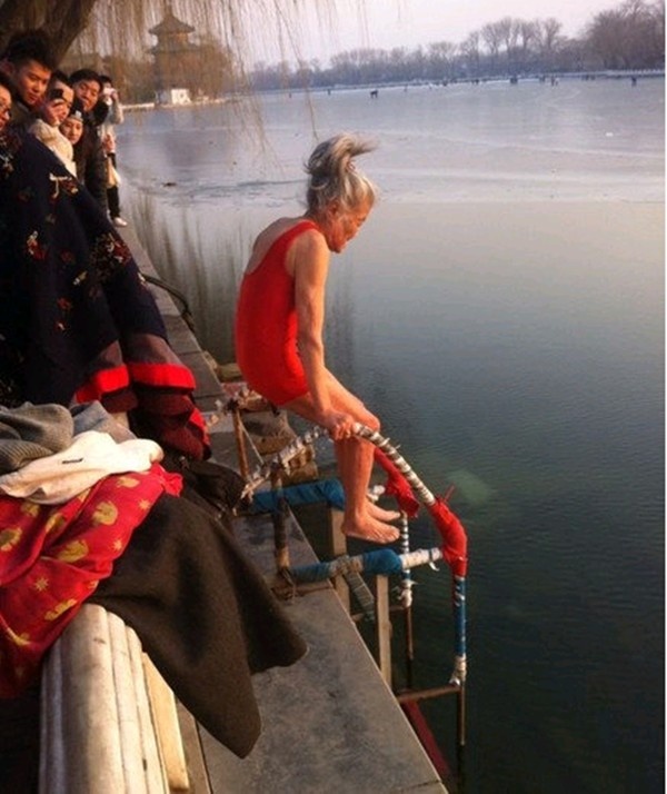Mấy ngày gần đây cộng đồng cư dân mạng Trung Quốc đua nhau chia sẻ hình ảnh về cụ bà bơi giữa trời đông giá rét được chụp vào ngày 28/12. Hình ảnh cho thấy, cụ bà đang bơi tại khu vực hồ Hậu Hải, thành phố Bắc Kinh, Trung Quốc.