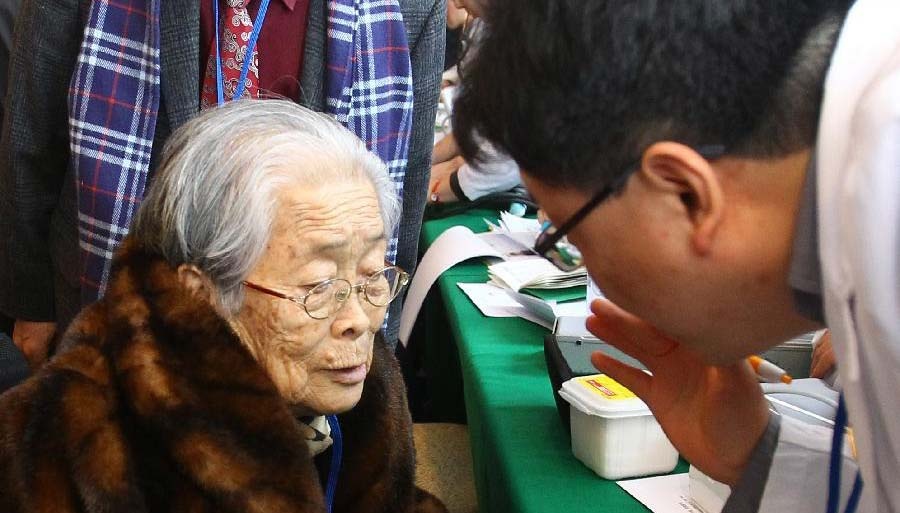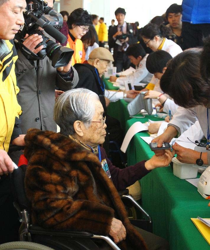 | Một bác sĩ hỏi thăm tình trạng sức khỏe của bà cụ 95 tuổi tại thành phố cảng Sokcho, Hàn Quốc. Cụ cùng 82 người già Hàn Quốc khác chuẩn bị đến Kumgang-san (Triều Tiên) để gặp thân nhân. Ảnh: News.cn. |