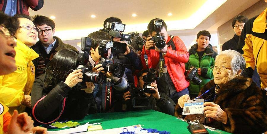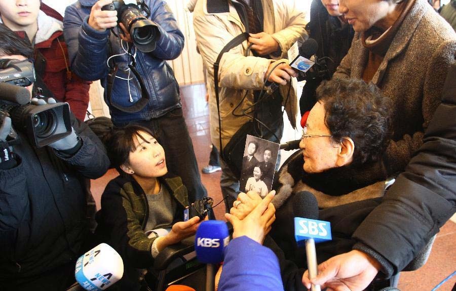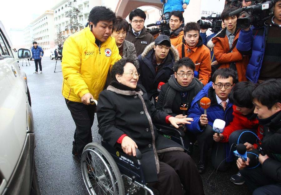 | Các nhà báo phỏng vấn một phụ nữ 85 tuổi. Cuộc đoàn tụ diễn ra trước cuộc tập trận chung Mỹ - Hàn ngày 24/2. Ảnh: News.cn. |