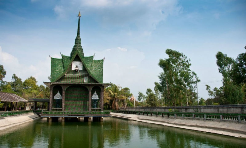 1. Chùa triệu chai bia Wat Pa Maha Chedio Kaew, Thái Lan: Được tạo nên từ 1,5 triệu vỏ chai bia tái chế, Wat Pa Maha Chedio Kaew được coi là ngôi chùa có kiến trúc đặc biệt nhất trong số 40.000 ngôi chùa Phật giáo ở Thái Lan. Ngôi chùa được xây dựng vào năm 1984, và hiện tại các tu sĩ Phật giáo vẫn đang tiếp tục xây dựng thêm nhiều công trình nữa ở đây. Du khách có thể tới thăm Wat Pa Maha Chedio Kaew tại tỉnh Sisaket, phía đông bắc Thái Lan.