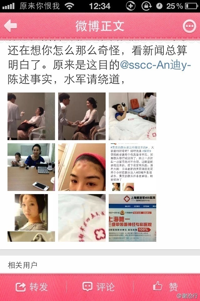 "Cô không nhớ năm ngoái cô đã đến bệnh viện của chúng tôi ư? Nhưng tôi thì nhớ. Tôi đã chứng kiến toàn bộ quá trình và cũng là người rót nước cho cô. Lúc đó cô nói muốn được thử trào lưu trán phồng và phải làm sao cho nó thật tự nhiên. Lúc đó, tôi đã rất ngạc nhiên nhưng bây giờ thì tôi đã hiểu" - Bicottionia viết trên blog cùng những hình ảnh nằm viện của Huỳnh Dịch.