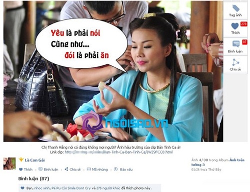 Thậm chí, khi những bức ảnh hậu trường của 2 diễn viên chính là Trấn Thành và Thanh Hằng xuất hiện, cộng đồng mạng ngay lập tức hưởng ứng bằng những bức ảnh chế có một không ai. Câu thơ chủ đề của Bản tình ca “Nhung nhớ nàng thơ, ngẩn ngơ câu hát”, cũng bị biến tấu thành những câu nói hài hước, được chèn vào hình ảnh hậu trường của Trấn Thành - Thanh Hằng. “Yêu mà không nói cũng như… đói mà phải ăn” trong bức ảnh hậu trường Thanh Hằng đang mặc đồ cổ trang ngồi ăn vặt, hay cảnh Trấn Thành ngơ ngác với phục trang áo the khăn đóng được chế thành hai câu “Cuộc tình dù đúng dù sai, người tốn kém nhất vẫn là người con trai”… là 2 trong số những bức ảnh chế Bản tình ca khiến cư dân mạng bật cười thích thú.