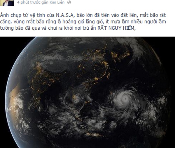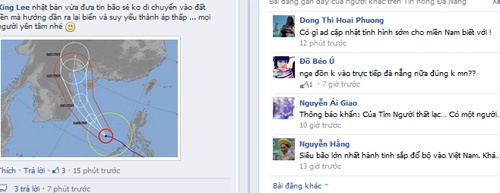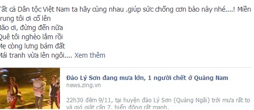 Với tấm lòng canh cánh hướng về quê hương, nhiều dân mạng đã thức trắng đêm để cập nhật thông tin bão lũ. Bạn Han Nhien Nguyễn viết những dòng xúc động: "Lòng nghẹn khi người dân ở quê đang oằn mình chỗng bão. Má ở nhà có một mình, cũng đã theo xe đi tránh. Con chả biết làm gì, cảm giác bất lực àm con đau quá. Cầu mong".