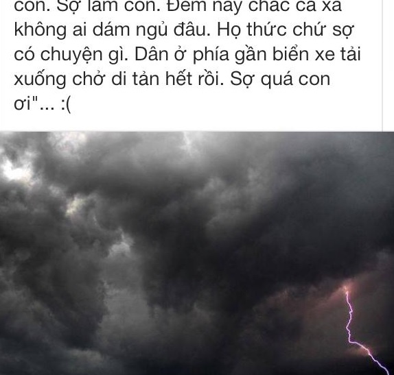 Bạn Nguyễn Thành Nam viết lại cuộc nói chuyện cùng mẹ: "Gọi điện thoại hỏi thăm. Má bảo: Lo lắm con, sợ lắm con. Đêm nay cả xã chắc không ai dám ngủ đâu. Họ thức chứ sợ có chuyện gì. Dân ở phía biển xe chở đi di tản hết rồi. Sợ lắm con ơi".