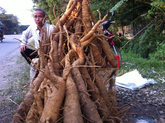 | Củ đinh lăng giả được bày bán ven đường Quốc lộ 6. |