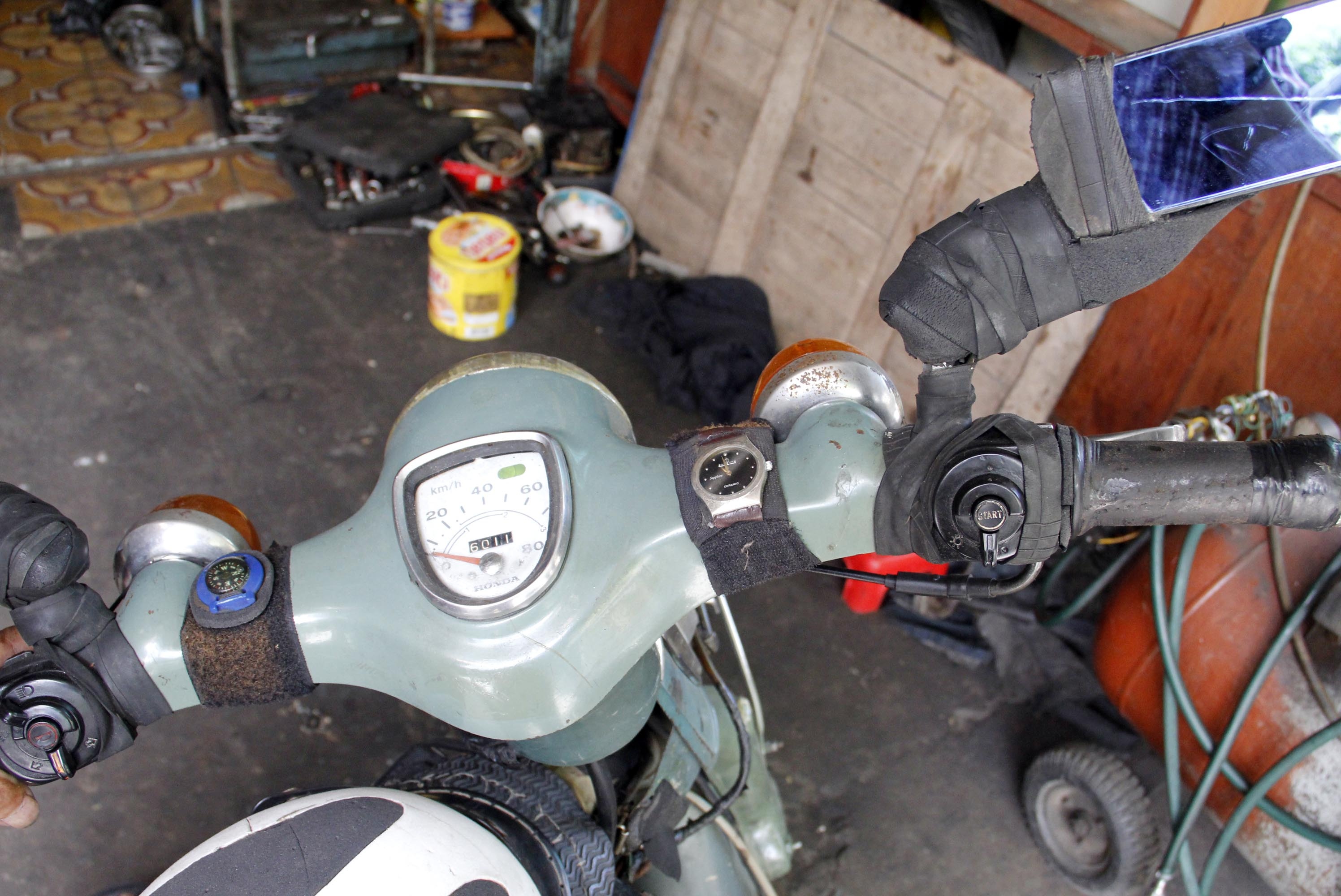 | Xe được lắp đến 2 phanh sau để tăng độ an toàn. Trên tay lái lắp thêm la bàn, đồng hồ xem giờ. Do mắt kém nên cụ Ngọc lắp thêm đèn ở phía trước để chiếu cho rõ. |