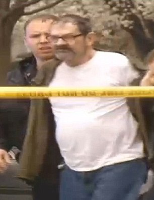 | Cảnh sát bắt nghi phạm (bên phải), một người đàn ông khoảng ngoài 70 tuổi, nhưng chưa tiết lộ danh tính. Ảnh: KCTV. |