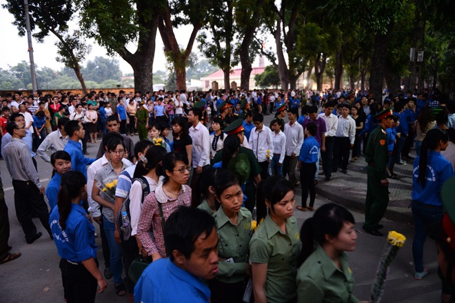 | Mặc dù đã biết tin gia đình Đại tướng Võ Nguyên Giáp sẽ đóng cửa vào 18h nhưng dòng người vẫn ùn ùn đổ về xếp hàng dài nhiều km từ Hoàng Diệu, Điện Biên Phủ đến phố Bắc Sơn đoạn gần Quảng trường Ba Đình (Hà Nội). |