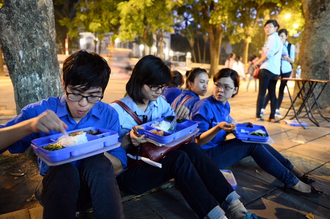 | 4 bà cháu cụ Dương Thị Đằm, 65 tuổi, từ Hải Dương, tranh thủ dùng bữa tối phía ngoài cửa bộ Ngoại Giao. |