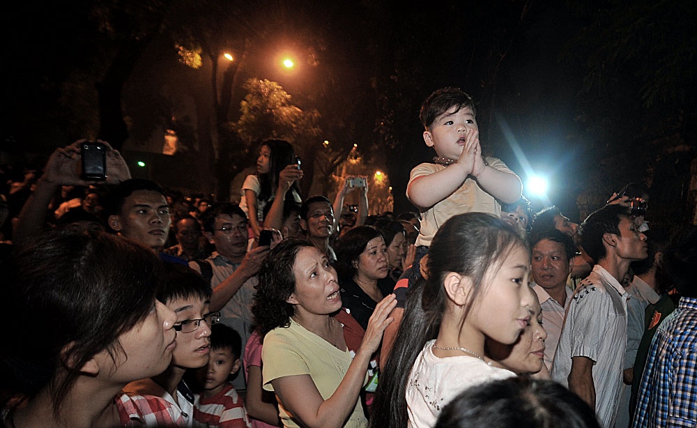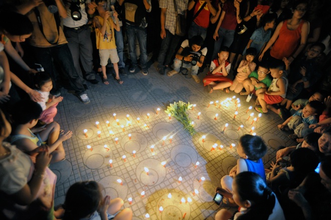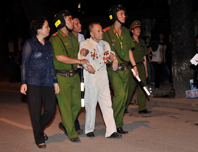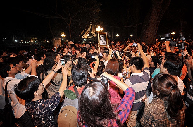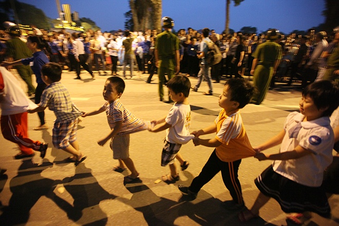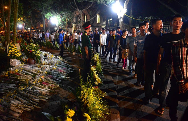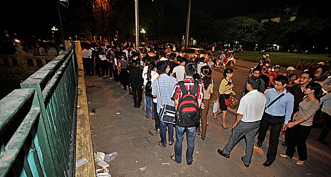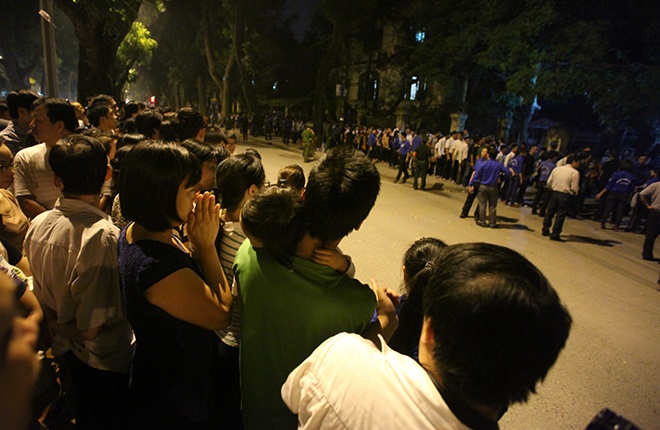 | 19h35, điểm cuối cùng của đoàn người ở phía trước bộ Ngoại giao, cách nhà Tướng Giáp hơn 2km. Vẫn lác đác có người nối dài thêm, chủ yếu là học sinh, sinh viên. |