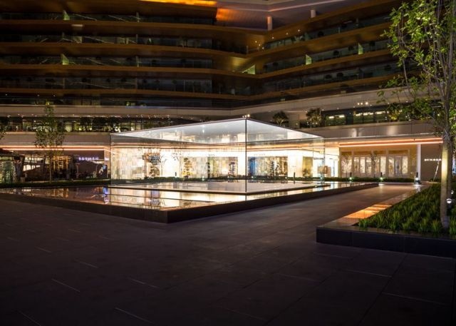 Cửa hàng bán lẻ dưới lòng đất này nổi bật với khối kính nổi trên mặt đất với 4 tấm kính dài 10m, cao 3m ghép lại với nhau. Kết cấu này độc đáo ở chỗ, nó không cần dùng chất kết dính bên ngoài giống như tại cửa hàng tại Fifth Avenue.