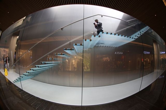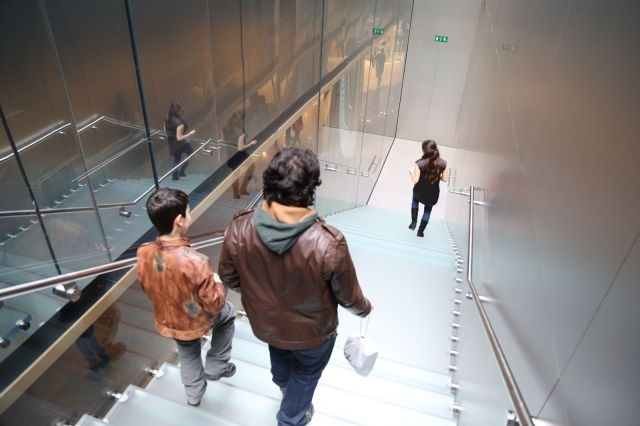 Nhìn từ dưới lên, người ta mới thấy được sự độc đáo của kiến trúc cầu thang làm bằng kính này. Mỗi bậc cầu thang là một tấm kính riêng biệt, được gắn vào tường.