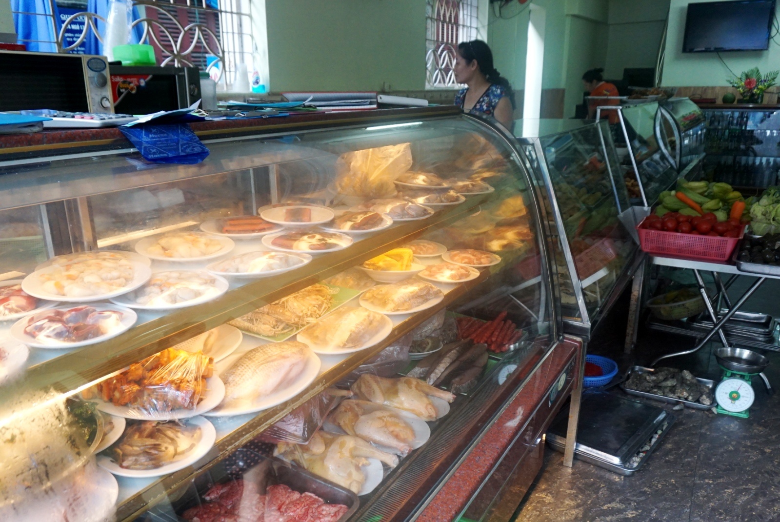 | Đồ ăn được sơ chế, bọc màng bao thực phẩm và bày trong tủ kính chờ khách hàng lựa chọn, đăng ký thực đơn tại quầy. Ảnh: Diệp Sa. |