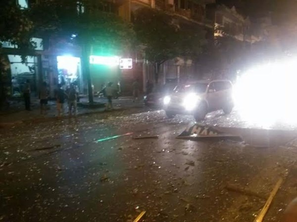 Vụ nổ tại cửa hàng gas trên đường Nguyễn Văn Cừ, TP.Hạ Long khiến nhiều vật dụng văng tung tóe, cửa kính của các cửa hàng bên cạnh bị ép vỡ tung, vương vãi khắp đường.