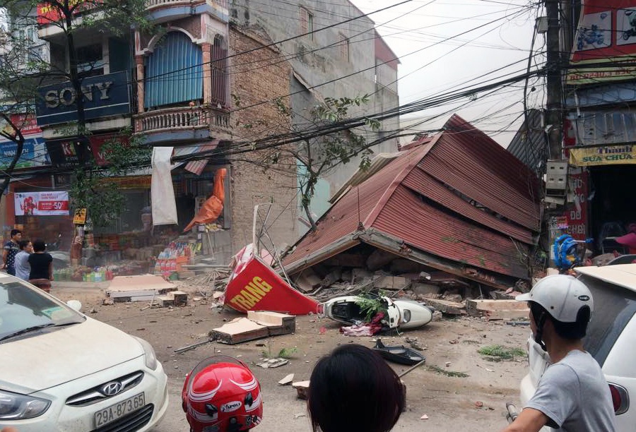 Mái hiên của ngôi nhà kế bên cũng bị kéo đổ, bụi bay mù mịt. Chiếc Spacy trắng bị mảng tường văng trúng, đổ dưới lòng đường.